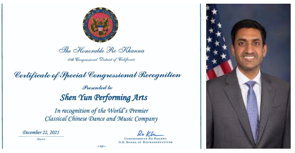 图7:国会众议员罗·卡恩纳(Ro Khann)在褒奖中,表彰“神韵艺术团是世界首屈一指的中国古典舞和音乐艺术团。”(明慧网合成图片) |