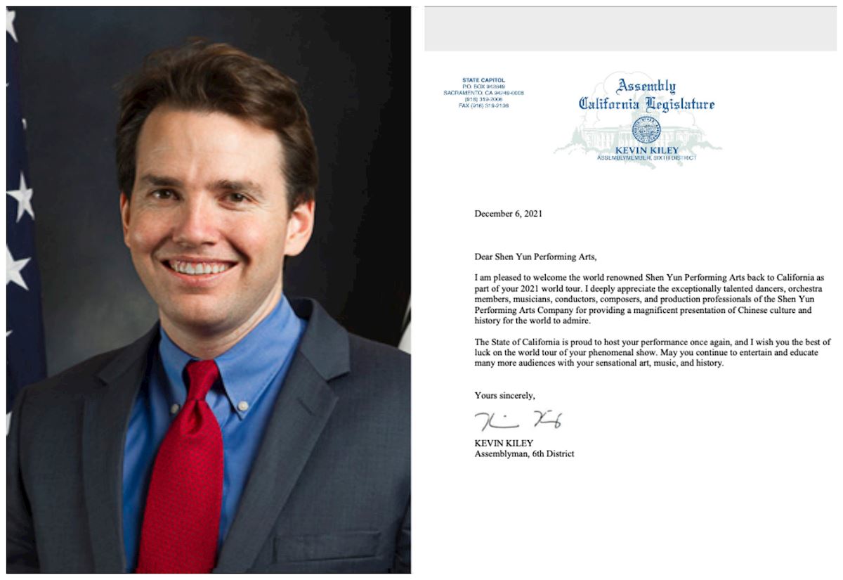 图8:加州众议员凯文·基利(Kevin Kiley)在贺信中说,欢迎世界著名的神韵艺术团重返加州。(明慧网合成图片) |