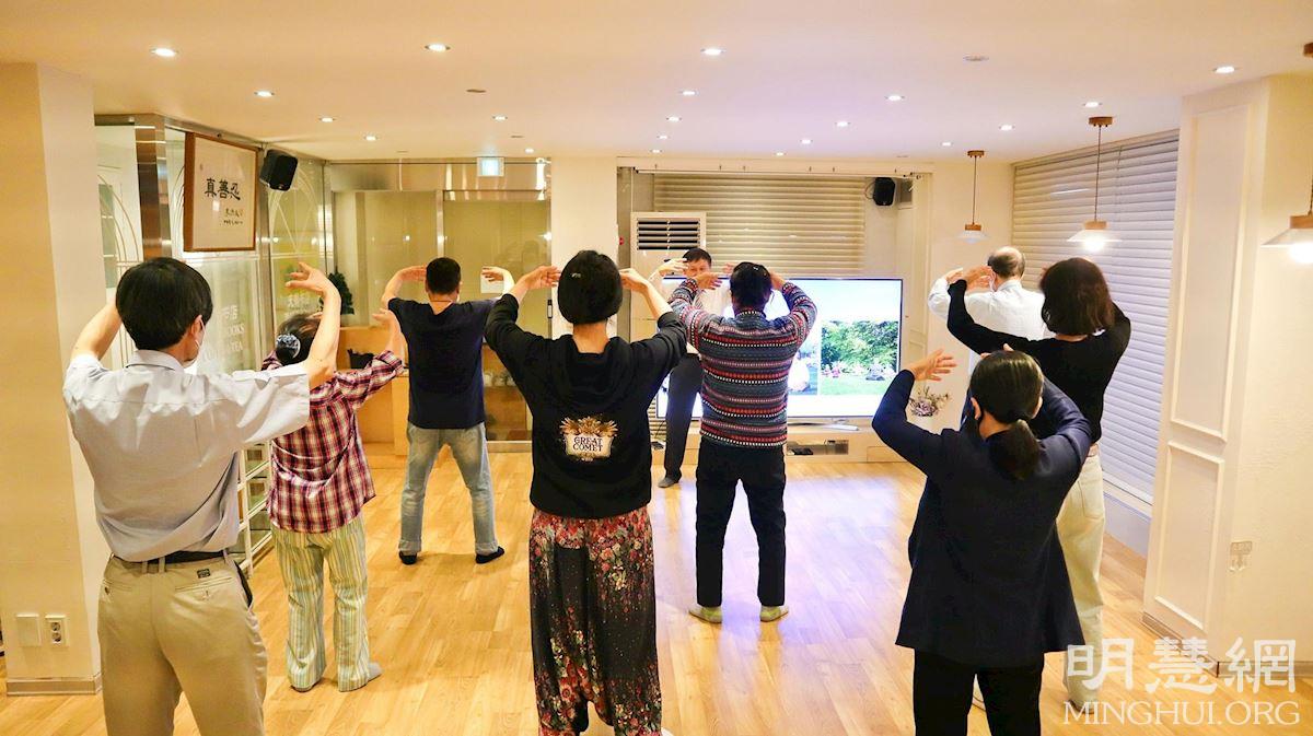 ![]() 图1:参加十月份九天班的新学员正在学习法轮大法第二套功法。 |