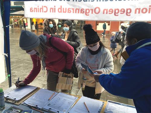 一位女士看着真相横幅念出了声:“法轮功,我知道,在英国我看到过你们。我知道法轮功在中国是被禁止的。活摘人体器官这个事情太残忍了,”她做出摇头的动作,对学员说:“我上次已经签过字了,不过我要再签一次。”