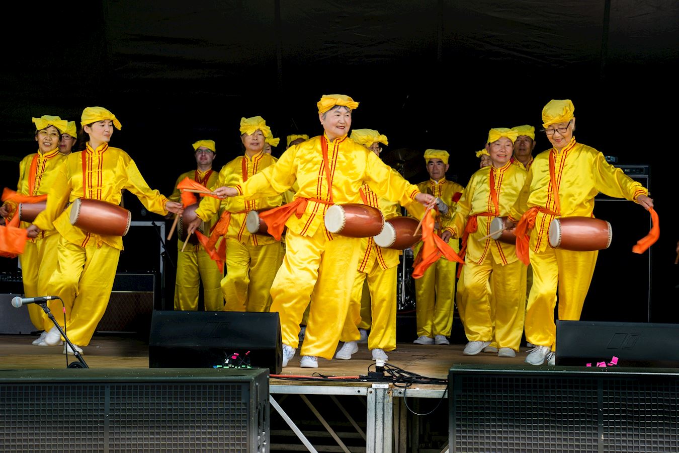 由新西兰法轮功学员组成的天国乐团和腰鼓队受到国庆日庆典主办机构的邀请,在当天的主舞台上表演。天国乐团吹奏了“法轮大法好”、“神圣的歌”、“凯旋”等曲目,腰鼓队表演了“新中国进行曲”、“三:退.保平安”和“法轮大法好”等舞蹈。表演前,国庆盛典主持人介绍了法轮功的功法和理念,还讲述了中共对法轮功长达二十一年残酷迫害的情况。