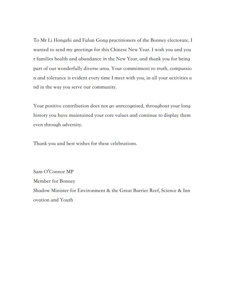 澳洲昆士兰州议员山姆·奥康纳(Sam O'Connor)先生的贺词