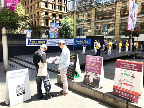 ![]() 图1:悉尼法轮功学员在悉尼金融和政界聚集地——马丁广场(Martin Place)上展示法轮功五套功法和真相展板。 |