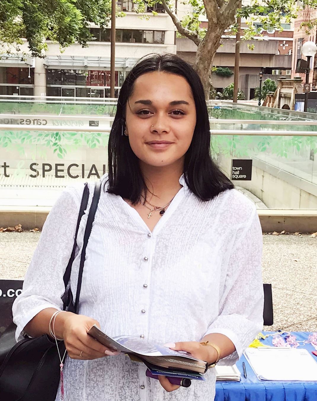 泰勒·沃尔夫格拉姆(Taylor Wolfgramm)在悉尼市政厅(Town Hall)法轮功学员讲真相展位前驻足,她了解真相后表示感谢法轮功学员持之以恒告诉人们真相,并说:“我诚挚祝福你们,我向法轮功创始人李洪志先生拜年!”
