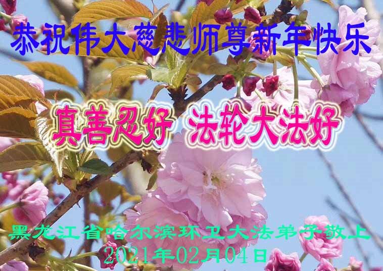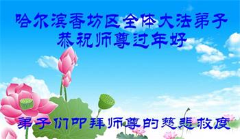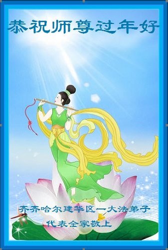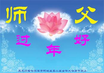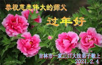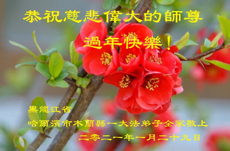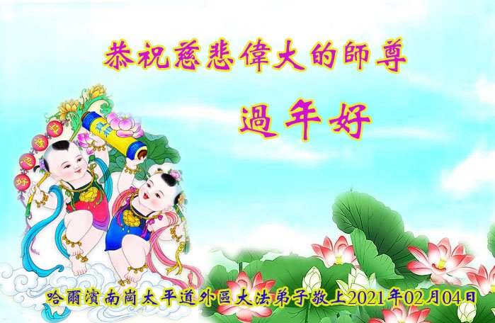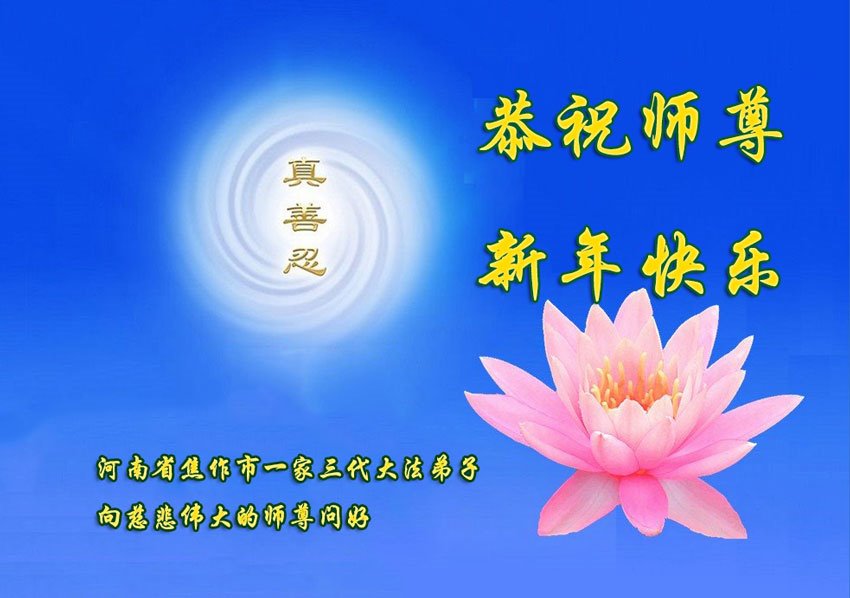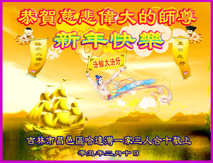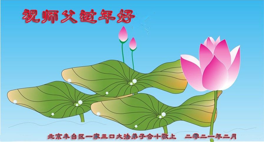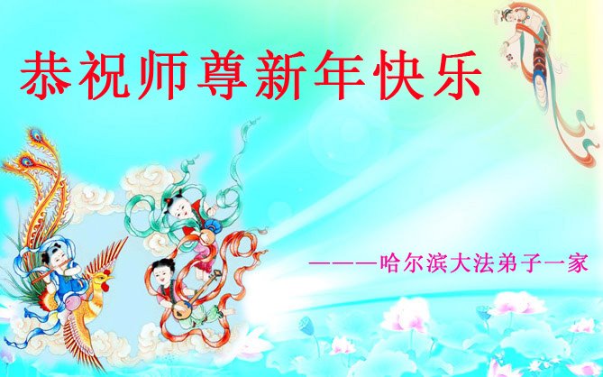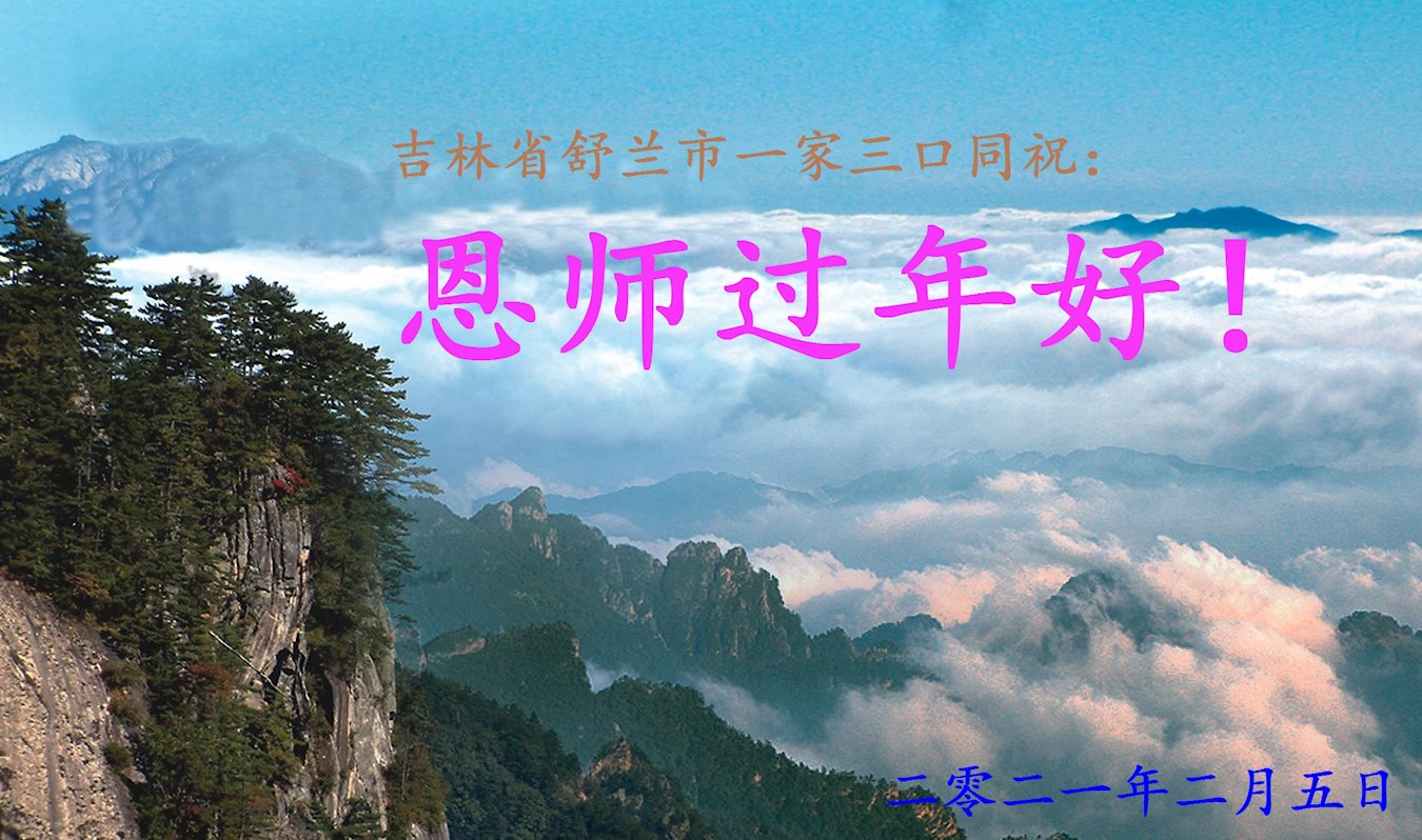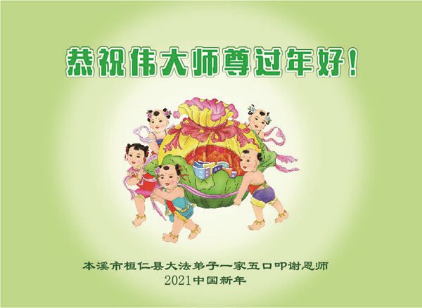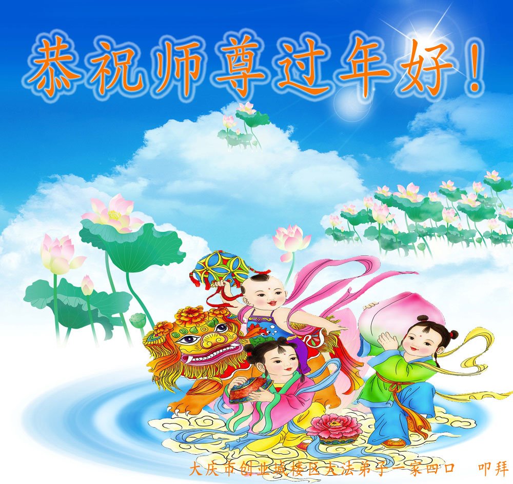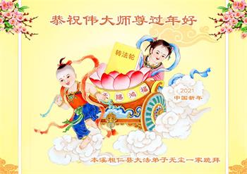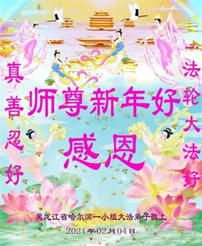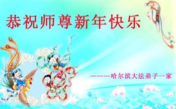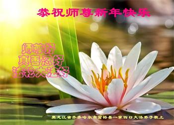 黑龙江省哈尔滨市一家人恭祝大师新年快乐!他们说:“在这中共病毒瘟疫肆虐、多灾多难的时候,我们不会惧怕,我们相信在大师的慈悲保护下,心怀善念,常颂‘法轮大法好,真善忍好!’这避瘟良方定会使全家平安健康,渡过劫难。”