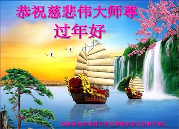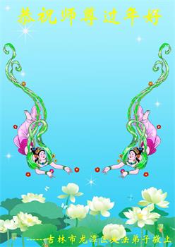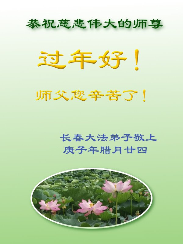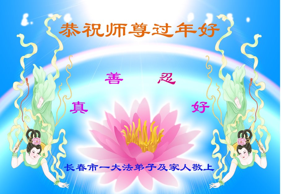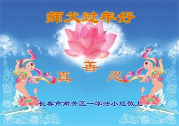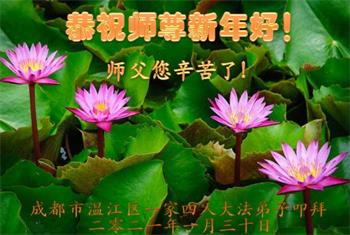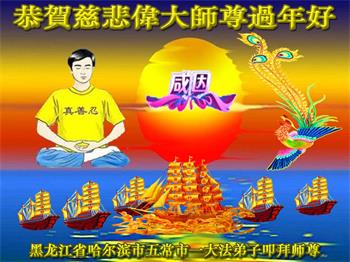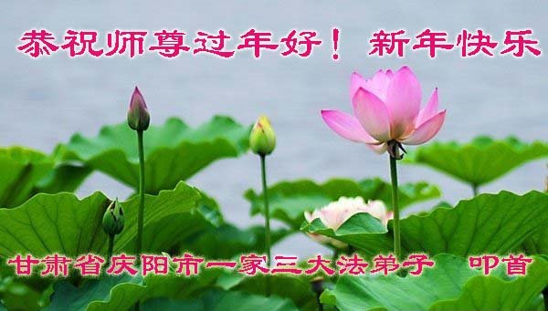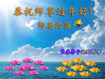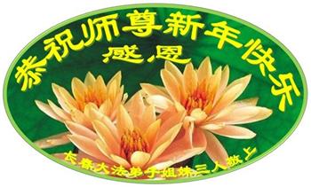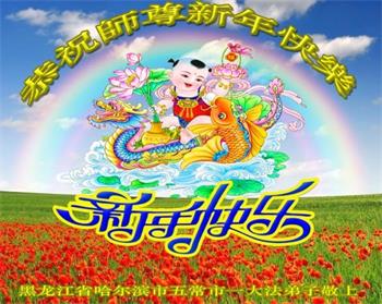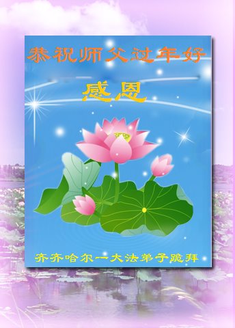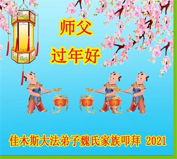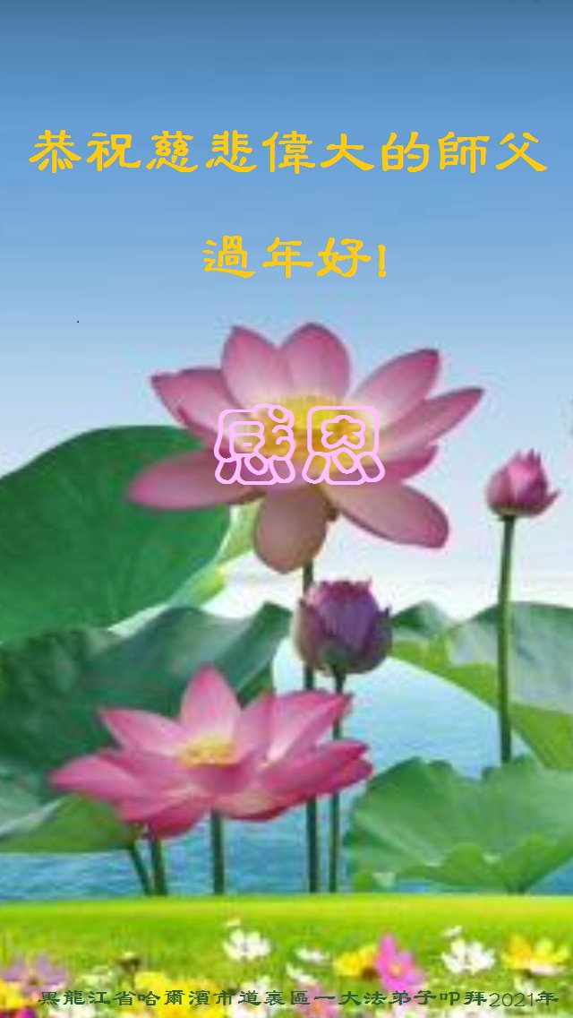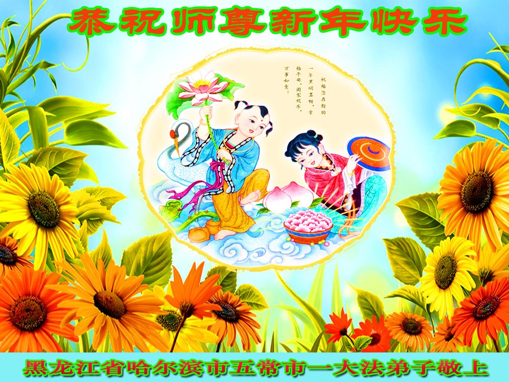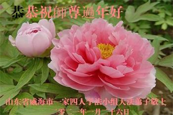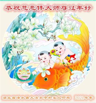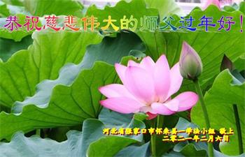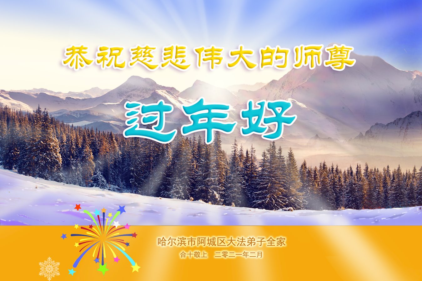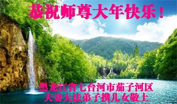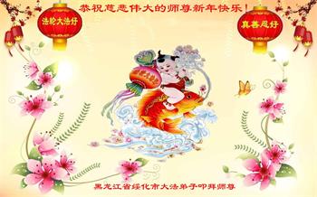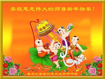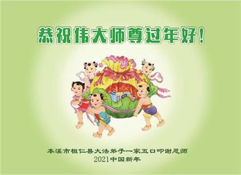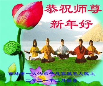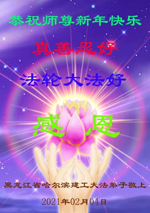 黑龙江省哈尔滨市一家人恭祝大师新年快乐!他们说:“在这中共病毒瘟疫肆虐、多灾多难的时候,我们不会惧怕,我们相信在大师的慈悲保护下,心怀善念,常颂‘法轮大法好,真善忍好!’这避瘟良方定会使全家平安健康,渡过劫难。”