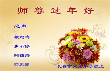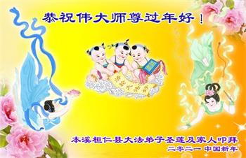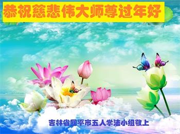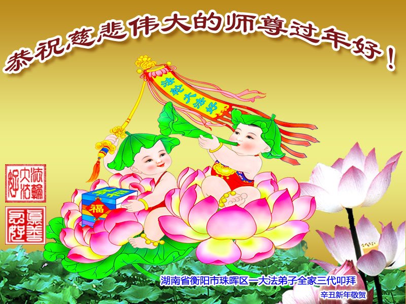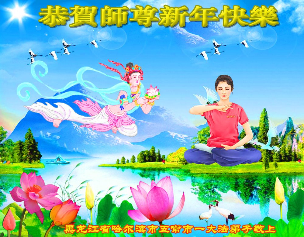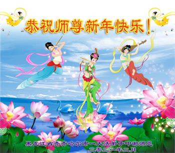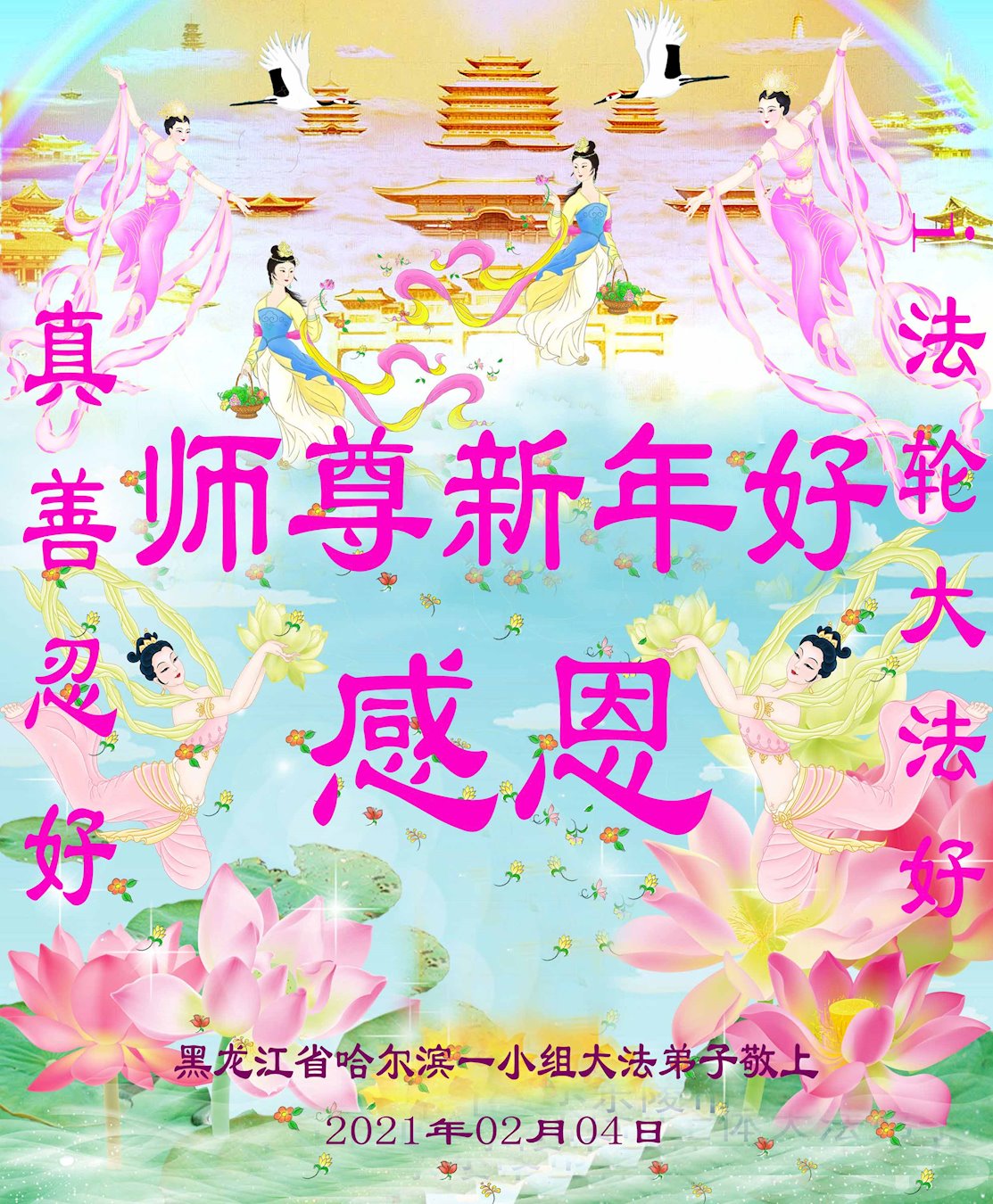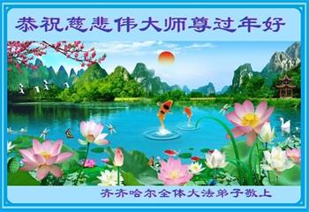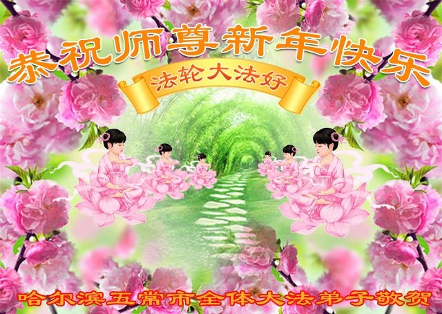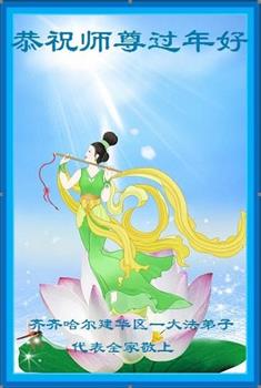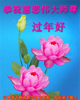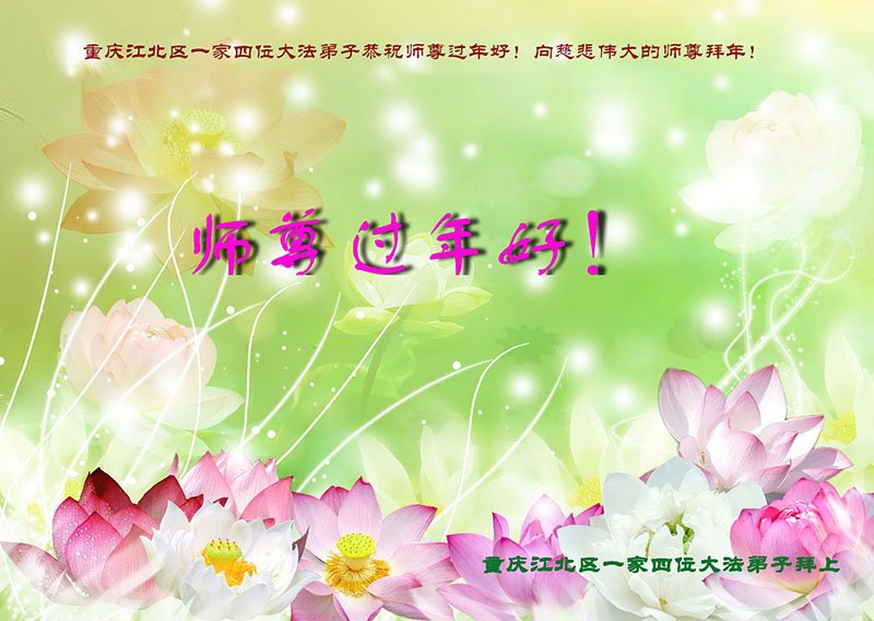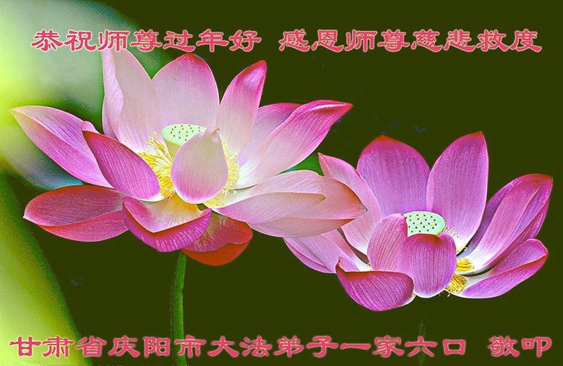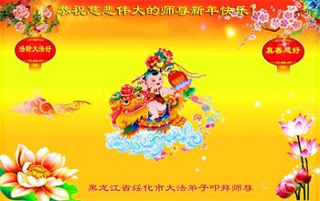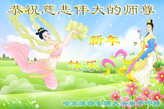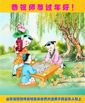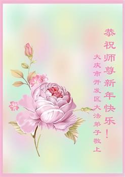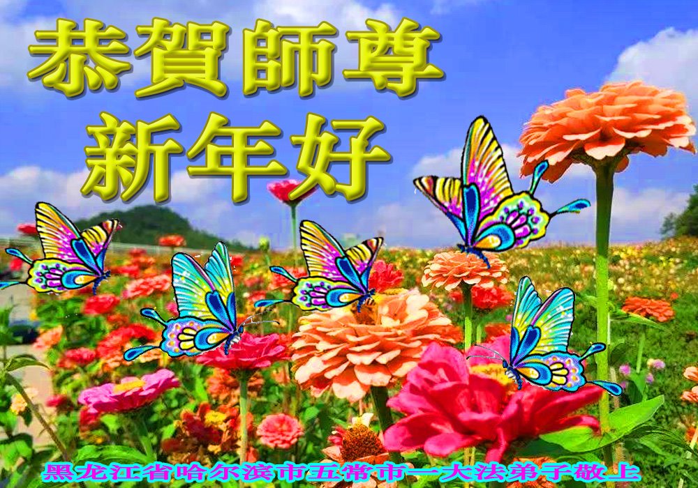 黑龙江省哈尔滨市一家人恭祝大师新年快乐!他们说:“在这中共病毒瘟疫肆虐、多灾多难的时候,我们不会惧怕,我们相信在大师的慈悲保护下,心怀善念,常颂‘法轮大法好,真善忍好!’这避瘟良方定会使全家平安健康,渡过劫难。”
