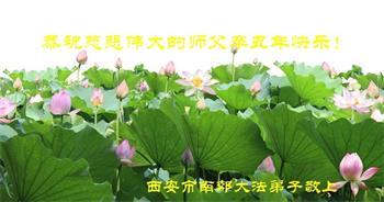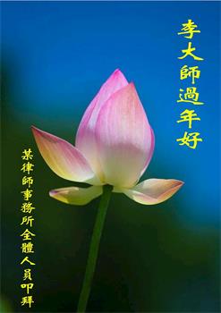 中国大陆一律师事务所全体人员发来贺词写道:“我们非常感谢您的慈悲救度!是您的佛光普照着中华大地,才使我们有机缘听闻真相。您的弟子秉承着您的法旨,不厌其烦的向世人讲述着真相,才使我们终于能够有机会得到您的慈悲眷顾……我们庆幸自己选择了正义。我们衷心感谢慈悲伟大的李大师!我们祈盼着您能够早日回归故国!”