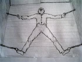 二零零三年十月,李顺江遭迫害,我也开始绝食反迫害,被关进监狱小号迫害一周。被戴上“工”字形刑具,叫做撑子,双手双脚夹在工字形的四个角,用螺丝拧紧,双手双脚就不能动了,人就被完全撑开了,再把刑具锁到地环上,人也就不能躺下了。