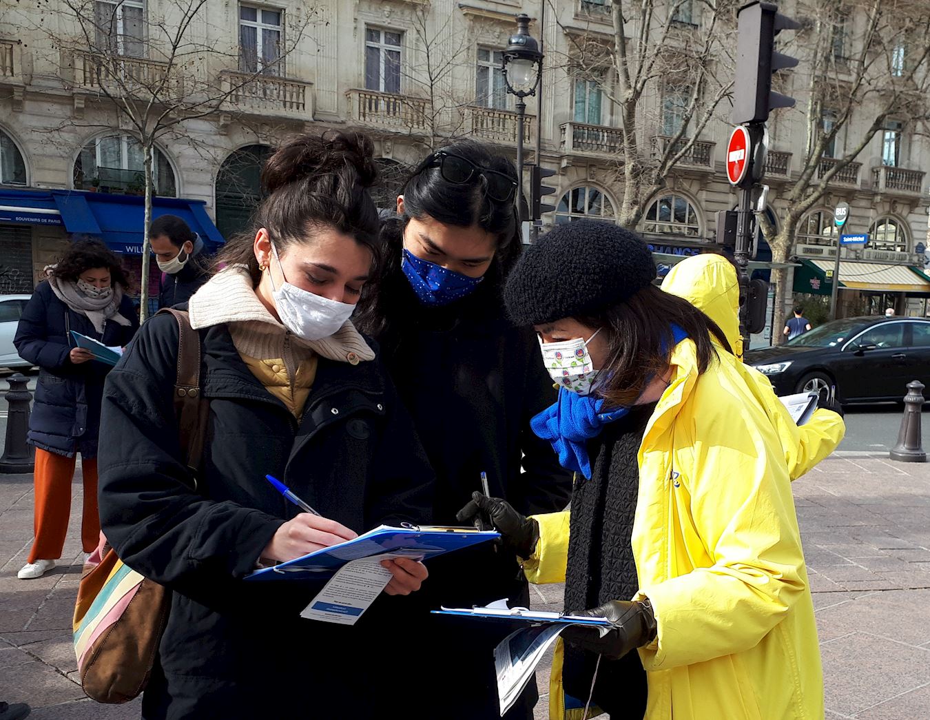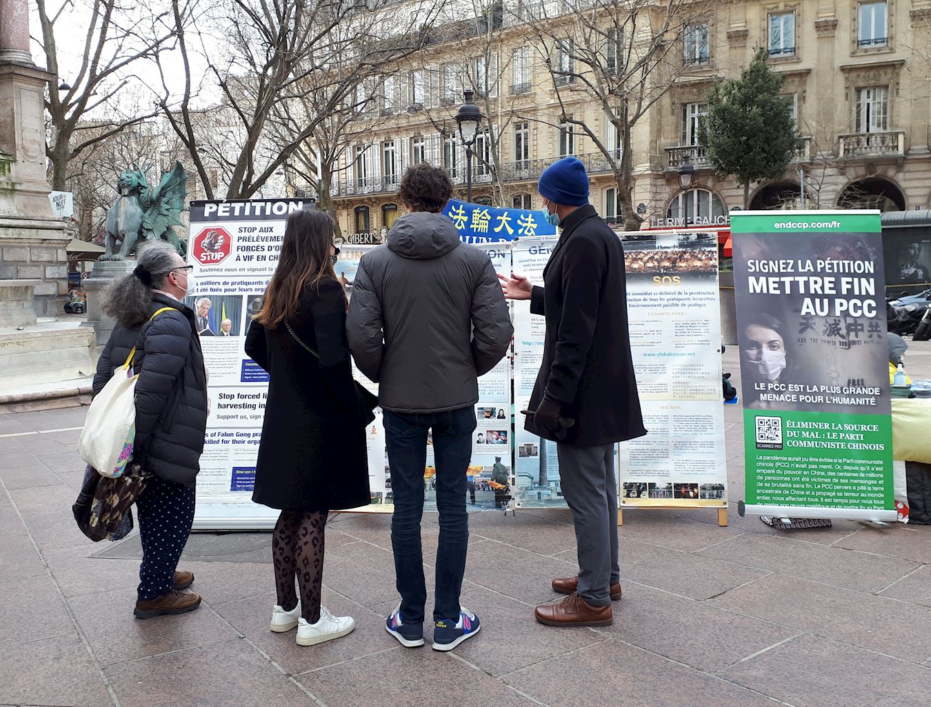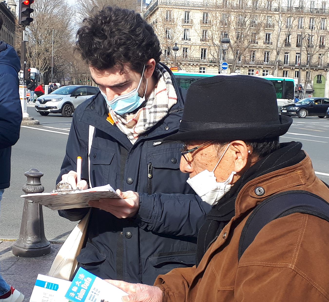 春天刚至,巴黎又一次进入了禁足隔离时期,这是自中共病毒疫情爆发以来的第三次禁足。以往的圣米歇尔广场车水马龙,如今格外平静,车辆、行人少了许多,但仍有户外活动的人们经过这里。行人不象以往那样匆匆而过,而是停下脚步,仔细观看展板或咨询法轮功信息,并在征签表上签字,支持法轮功学员的反迫害。