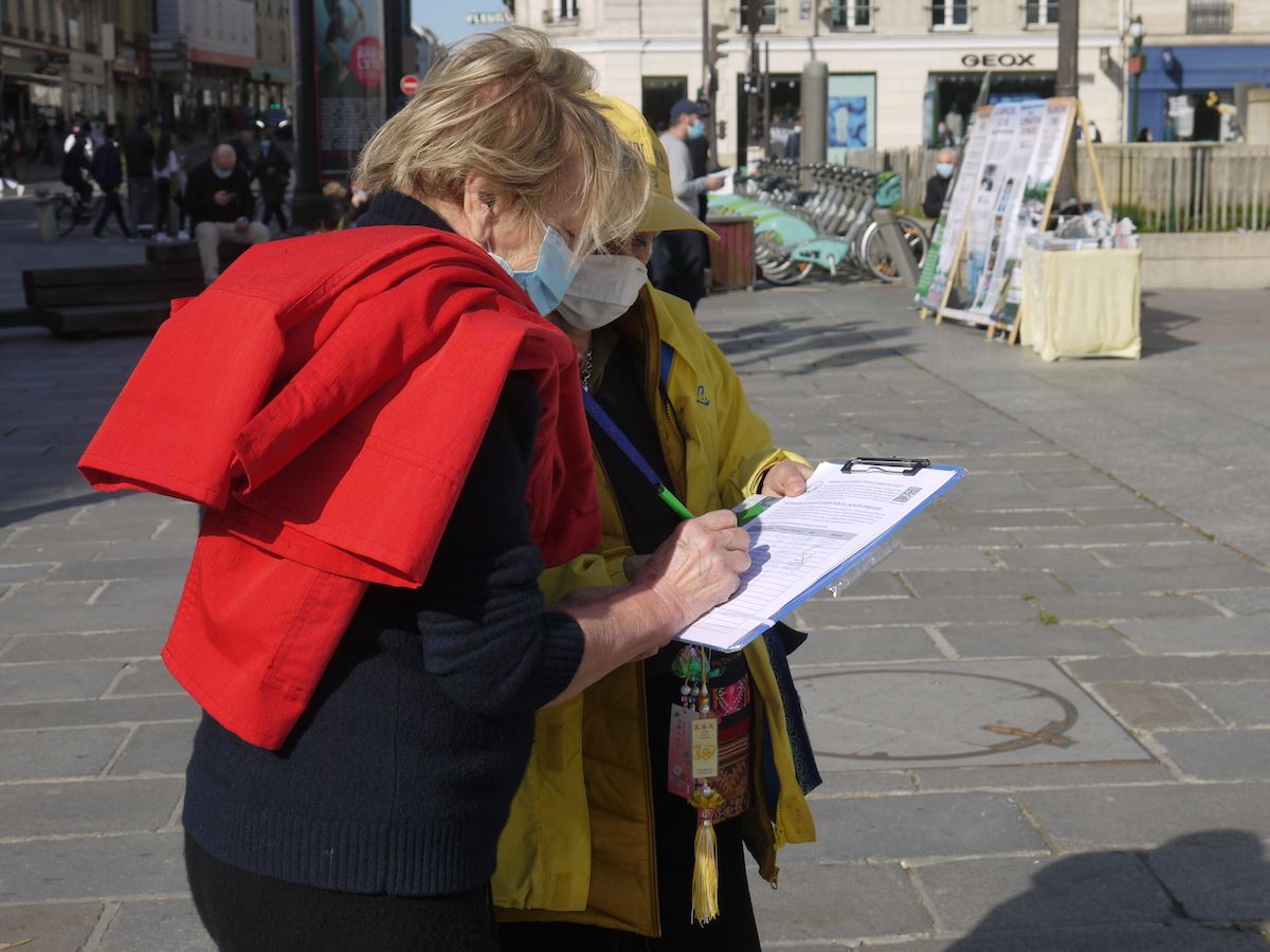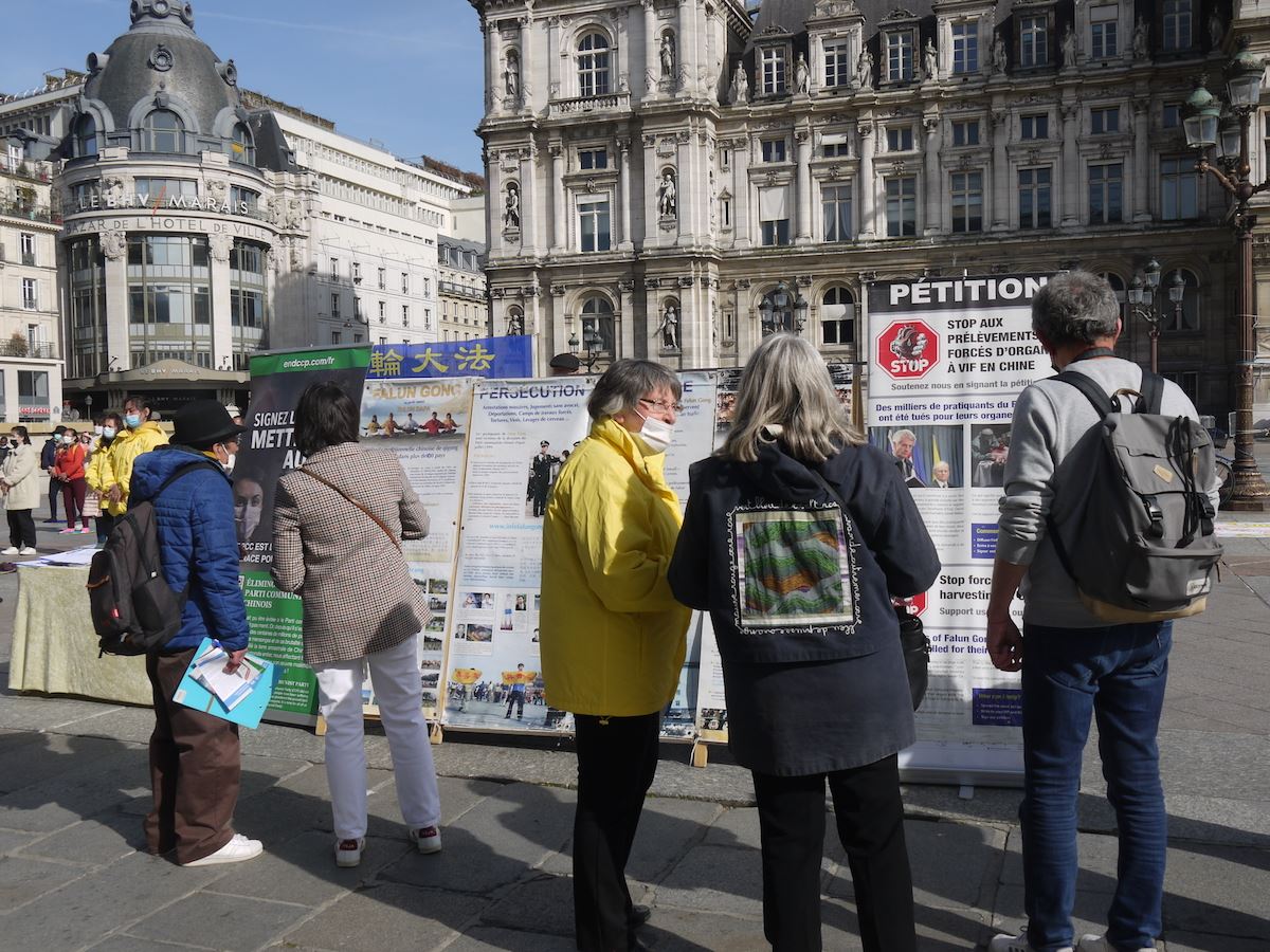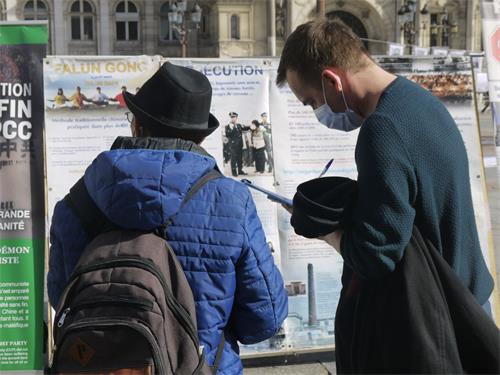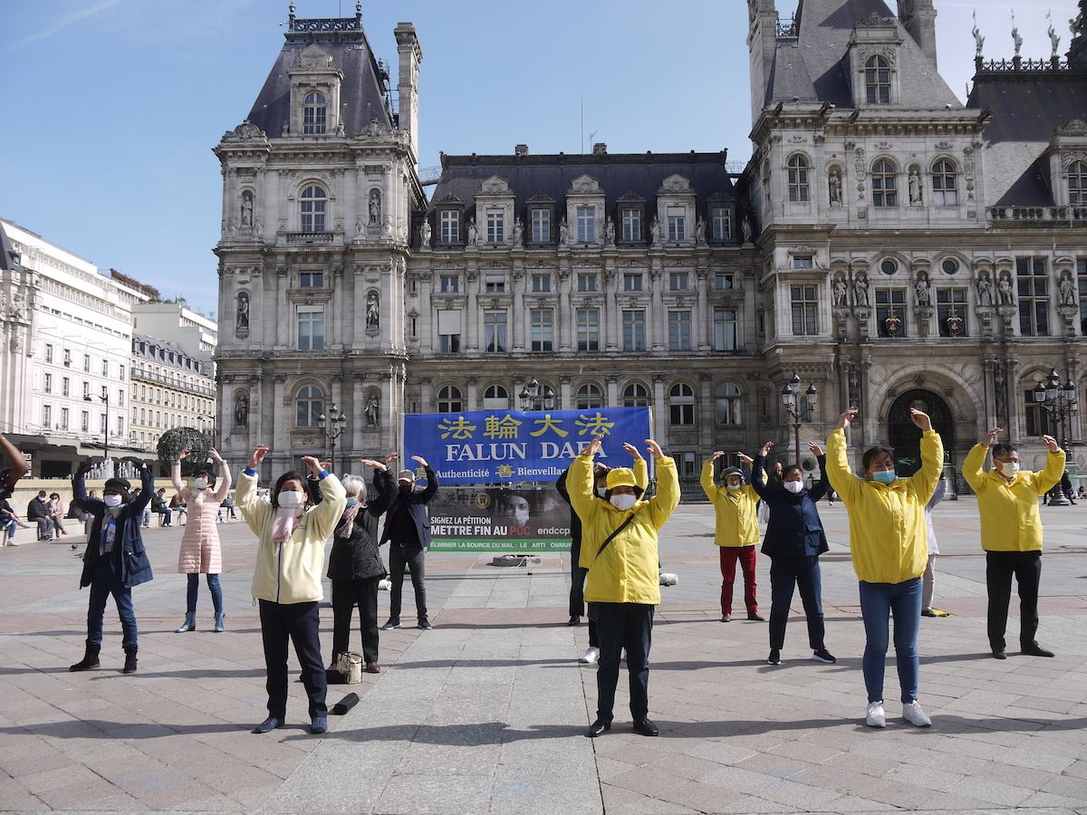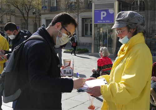 巴黎市政厅位于巴黎市中心,虽然是政府禁足期间,但过往的行人也很多。人们自觉保持社交距离,在法轮功学员活动地段周边的枕木上歇息,阅读真相资料或观看法轮功学员炼功。