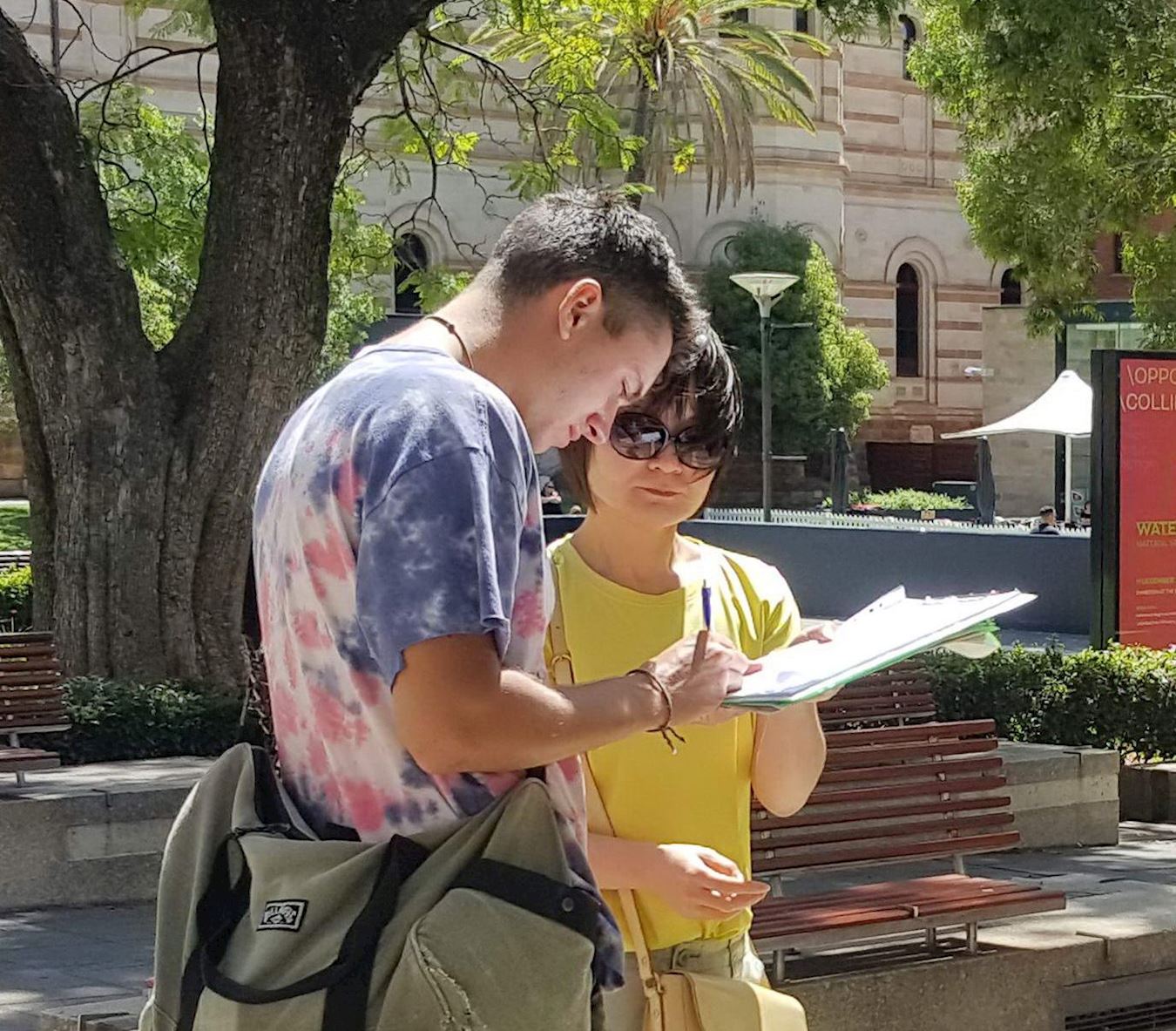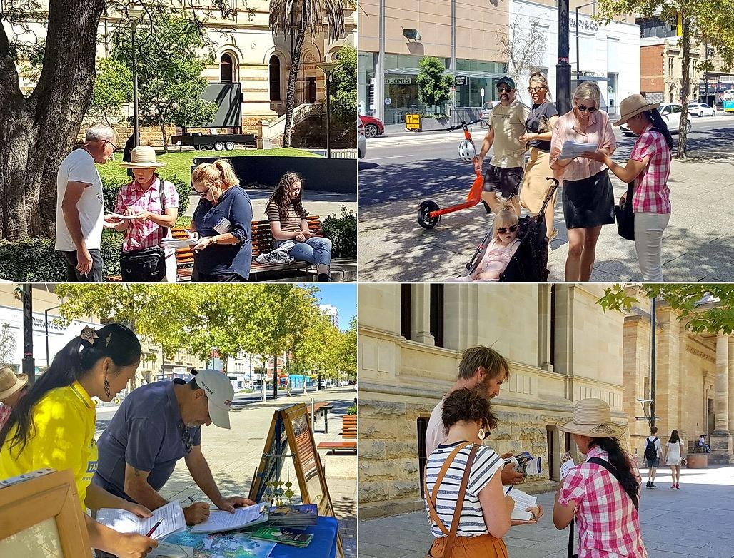 在二月二十一日阿德莱德大学附近举办的征签活动中,人们踊跃签名;有的人初次听法轮功真相,表示要多了解后才签名,但随着听学员讲真相,当即就签名;州立艺术馆一个工作人员,接下一张传单,过一会又来拿另一种揭露中共活摘器官罪恶的资料,表示回去要进一步了解法轮功。
