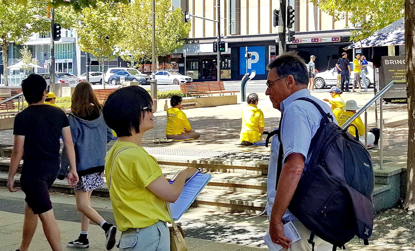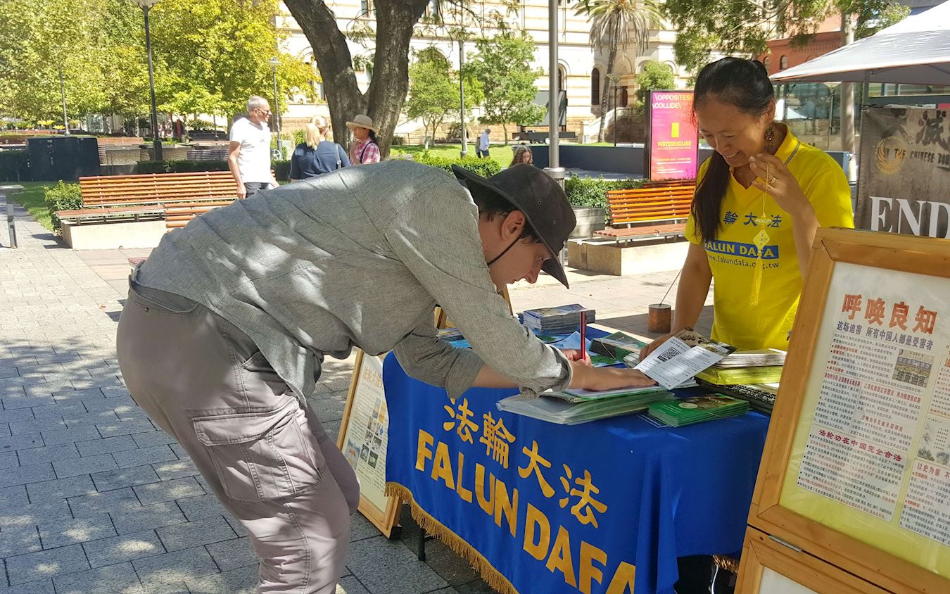 移居菲律宾的知名摄影记者凯文·R·哈姆多夫(Kevin R, Hamdorf)是阿德莱德本地人。他在真相点与法轮功学员交谈,透露出对中共威胁世界其它国家的担心。法轮功学员告诉他,要分清中共不是中国,向他推荐了法轮功学员办的真实可信媒体,他表示会去阅读了解。