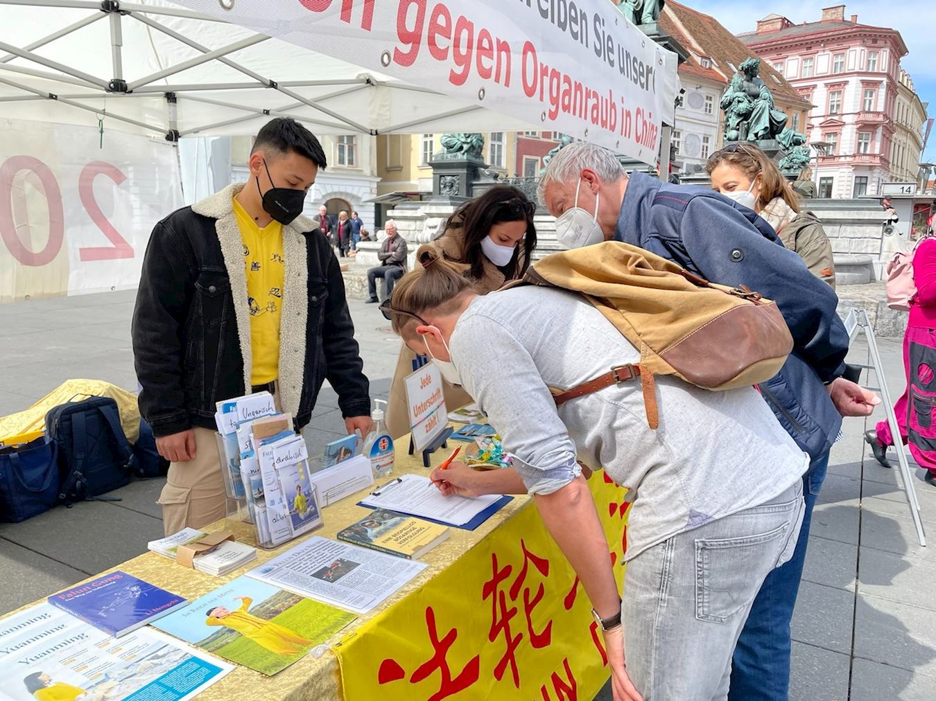 ![]() 图1~5:二零二一年四月十日,奥地利法轮功学员在格拉茨设立真相点,向人们介绍法轮功,并揭露中共的迫害。许多路人驻足了解,并纷纷签名支持反对中共活摘法轮功学员器官。 |