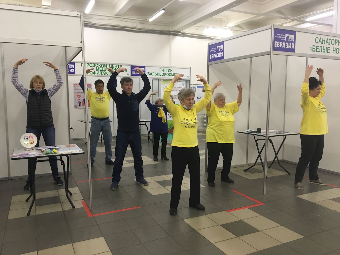 “欧亚大陆”中央大厅的屏幕上一直在播放法轮功师父传法教功的短片。学员每天在中心展台上两次展示功法并表演舞蹈。法轮功学员表演的舞蹈的名字叫“殉难”,是纪念被中共迫害致死的法轮功学员,讲解的学员告诉听众,中国古老文明被中共恶魔迫害,很多人倾听并非常理解,他们对舞蹈表演者致以掌声。