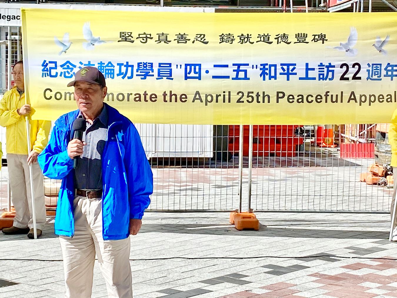 知名人权律师凯瑞·高尔(Kerry Gore)在集会发言中说:“一九九九年四月二十五日是一个非常重要的事件。万名法轮大法修炼者在北京中南海的中共领导大院外呼吁,要求释放在天津被非法拘留的法轮功学员。上访的法轮功学员只是希望捍卫自己的基本人权。这次活动引起了世界和国际媒体的关注。”