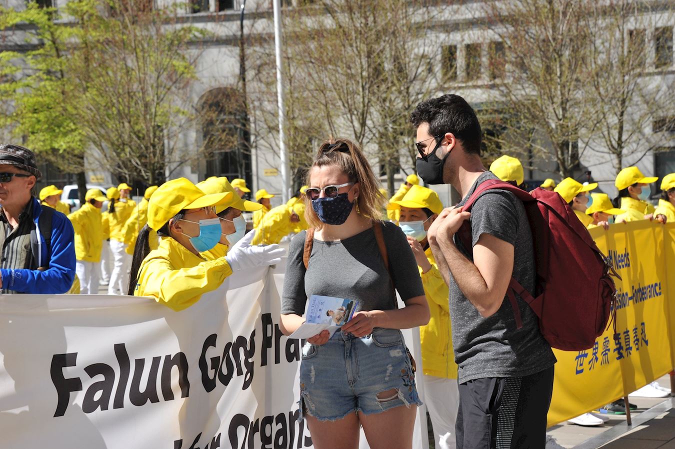 居住在温哥华岛的辛迪(Cindy)当天特意前来观看这个活动,并在一旁跟着学员炼功。当学员上前与她攀谈时,她告诉学员,她一直想要了解法轮大法已经很久了,但是因为种种原因,就搁置了。直到几个星期前,她在网上找到了一位法轮大法修炼者,现在她已经开始阅读法轮功最主要书籍《转法轮》。当得知温哥华举办纪念“四二五”的活动,她特地赶来观看的。