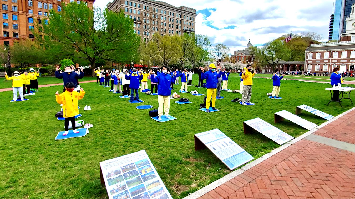![]() 图1:大费城地区部份法轮功学员在美国国家独立历史公园的费城自由钟广场举办活动,纪念万名法轮功学员一九九九年四月二十五日在北京和平上访二十二周年。 |