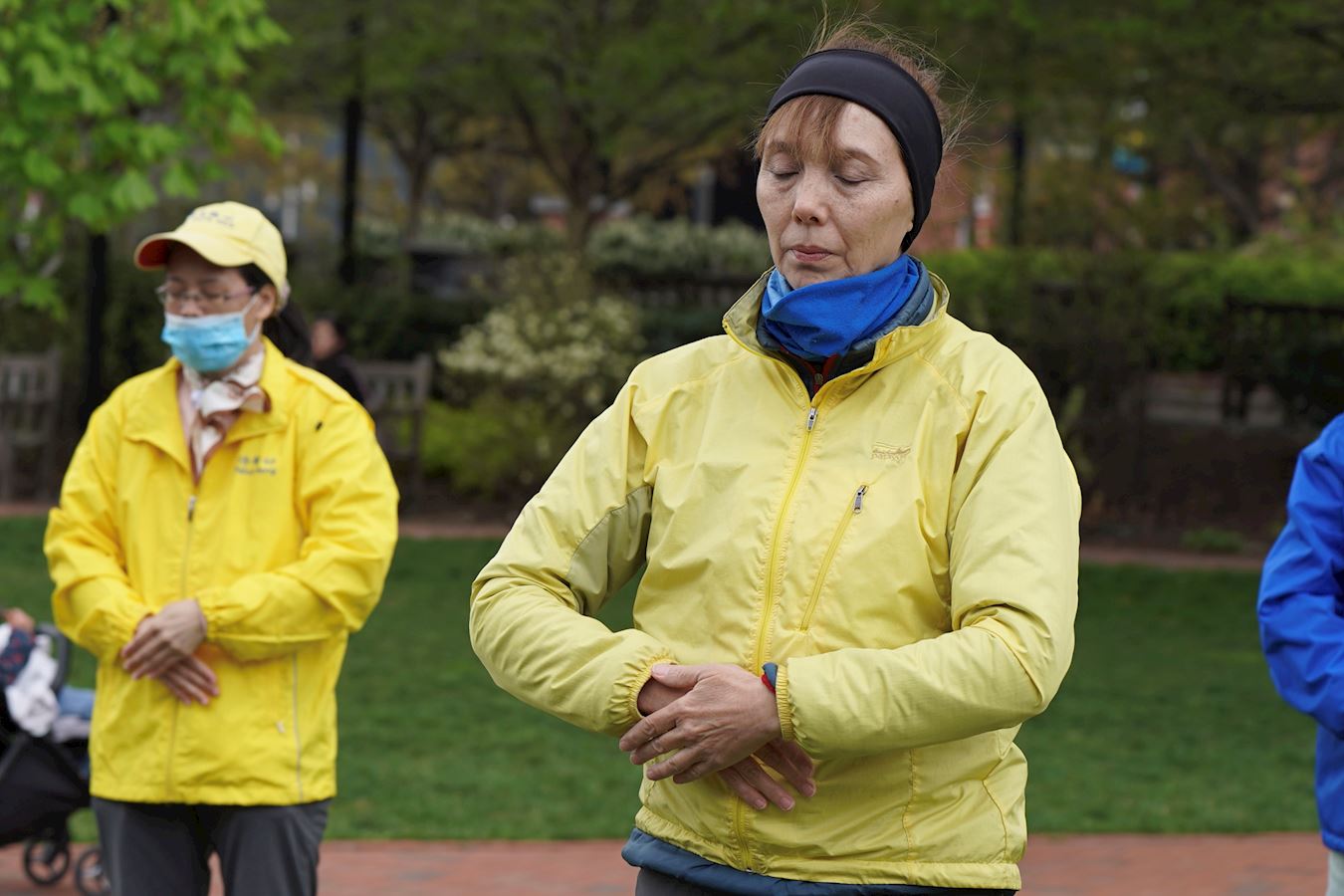 ![]() 图5:西人法轮功学员泰瑞(Terri Morse)在炼功。 |