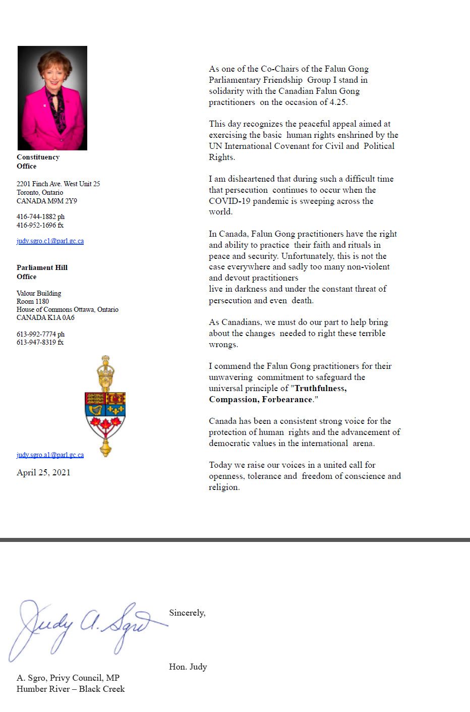 国会法轮功之友的另一位联合主席斯格若(Judy Sgro)议员在声明中赞扬法轮功修炼者坚定不移地对真、善、忍普世原则的维护。