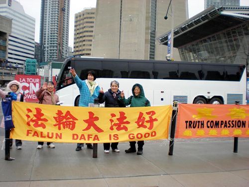 ![]() 图6:在多伦多电视塔景点讲真相的王金菊(中间挥手者)跟旅游团的客人挥手告别。 |