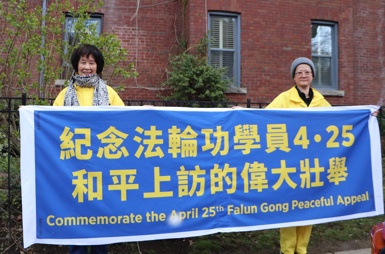 ![]() 图7:二零二一年四月二十二日,王金菊在多伦多中领馆前拉横幅纪念今年的四二五。她说:迫害不停止,我们讲真相不停止。 |