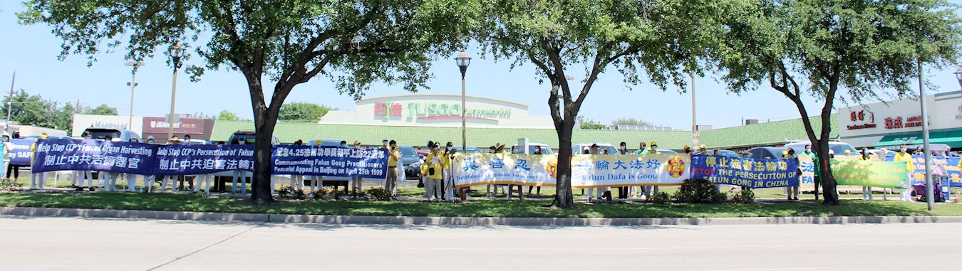 集会发言结束后,真相车队开始游行,环绕中国城,继续传递真相信息。