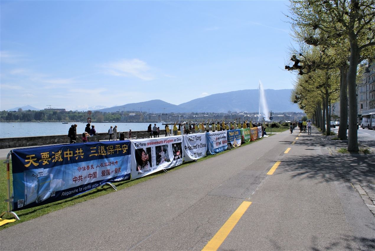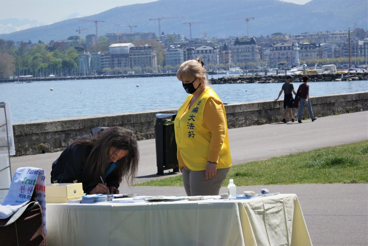 今年的四月二十五日,正逢周日,天气晴朗,来日内瓦湖畔游玩的民众很多。学员们沿街拉起醒目的横幅,通过集体炼功展示法轮功功法,并向民众发放介绍法轮功的材料,讲解法轮功被中共迫害的真相。