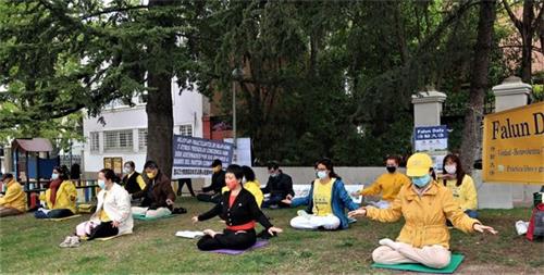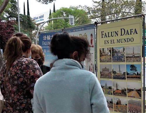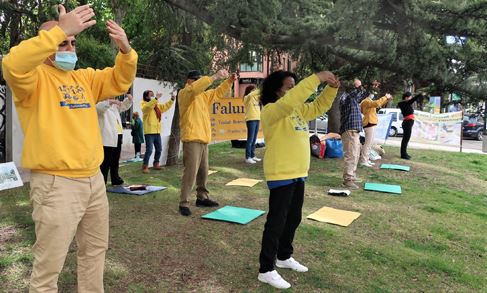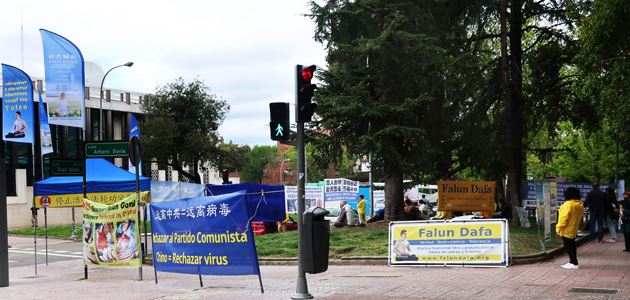 法轮功学员展开一面面横幅和图片真相板,告诉世人在中国正发生并持续了二十二年的中共对法轮功学员残酷迫害的暴行。醒目的横幅、悠扬的炼功音乐和演示五套功法的法轮功学员们吸引了往来的路人。人们纷纷停下脚步,阅读展板和传单,并签字支持法轮功学员的正义之举。