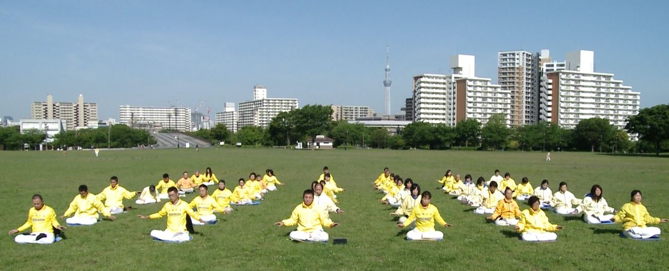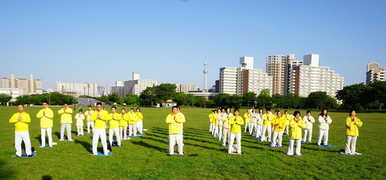 清晨,东京的法轮功学员来到公园,伴随着炼功音乐,整齐地展示法轮功五套动作优美的功法。