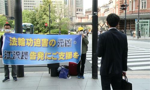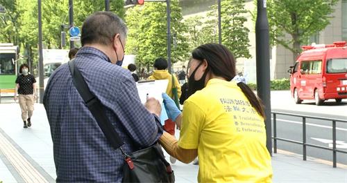 炼功结束后,在东京、新桥、秋叶原等繁华车站,学员们摆出真相看板,派发真相资料,向人们讲述中共长达二十二年对法轮功的残酷迫害。路人在了解了真相后纷纷签名支持法轮功。