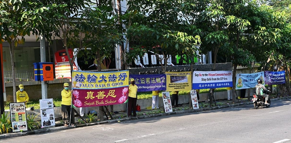 当天下午,雅加达法轮功学员的和平集会活动中,展示了很多横幅和真相图片展板,呼吁结束对法轮大法的迫害,停止从因信仰而被非法拘留的法轮功修炼者身上活体摘取器官;也呼吁将迫害法轮功元凶江泽民绳之以法,因其对中国大陆的法轮大法学员犯有反人类罪和种族灭绝罪。
