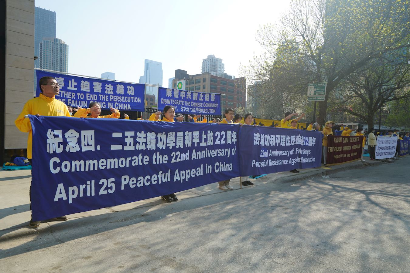 ![]() 图1~3:法轮功学员在美国芝加哥中领馆前集会,炼功,纪念“四·二五”法轮功学员万人和平上访二十二周年。 |