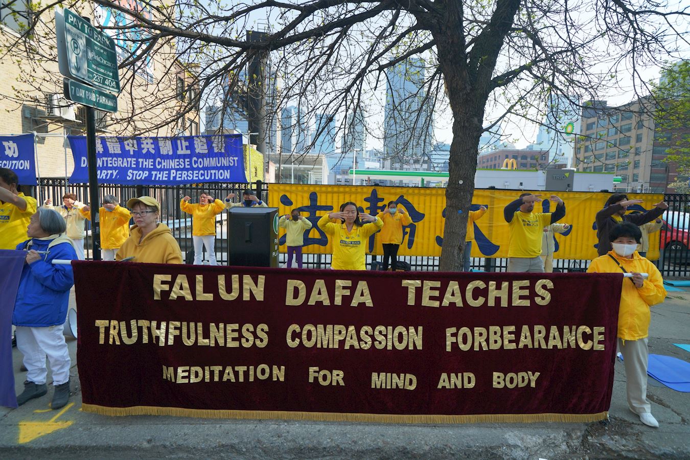 法轮功学员在中领馆对面打出“纪念四·二五法轮功学员和平上访二十二周年”、“法轮大法好”、“停止迫害法轮功”,“解体中共, 制止迫害”等横幅,并在路边的人行道上平静地集体炼功,或派发法轮功真相传单,呼吁人们关注这场持续了二十二年的迫害。一些过往车辆鸣笛表示支持。很多行人驻足观看展板,对法轮功学员炼功的场面拍照录像,有的向法轮功学员拿取传单,希望了解更多资讯,并对法轮功和平反迫害表示支持。