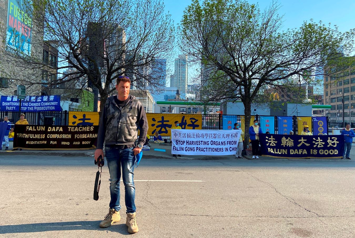 Mauricio Ramirez在芝加哥中领馆旁的一家餐馆工作。他说,在过去八年里,他目睹了法轮功学员通过平和、坚韧的活动和方式表达了他们的诉求。人们都应该学习这样的方式。