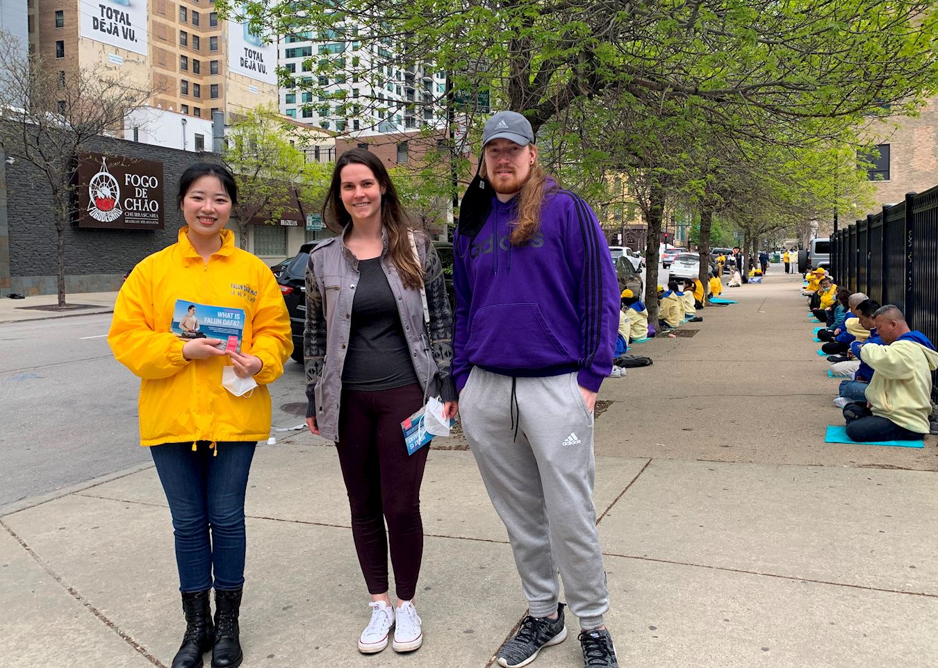 Matt和Michelle Kamer第一次听说法轮功。他们都很震撼于身处闹市中,法轮功学员平静的炼功场面。Matt说,“我自己也会练习打坐,可是我无法想象在芝加哥城里这么吵闹的环境里,他们真的可以做到,太让人佩服了!”