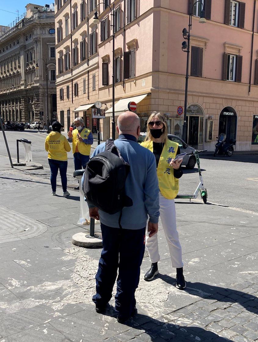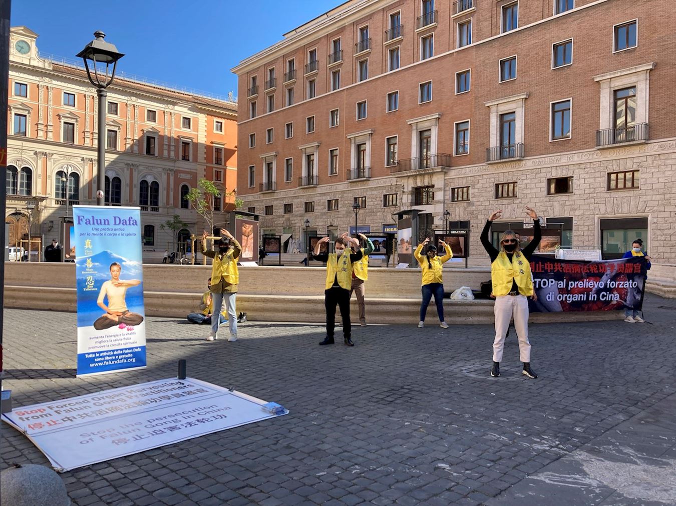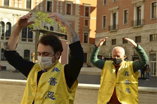 ![]() 图1~2:罗马法轮功学员在罗马市圣西尔维斯特广场(Piazza San Silvestro)举行炼功、讲真相活动 |