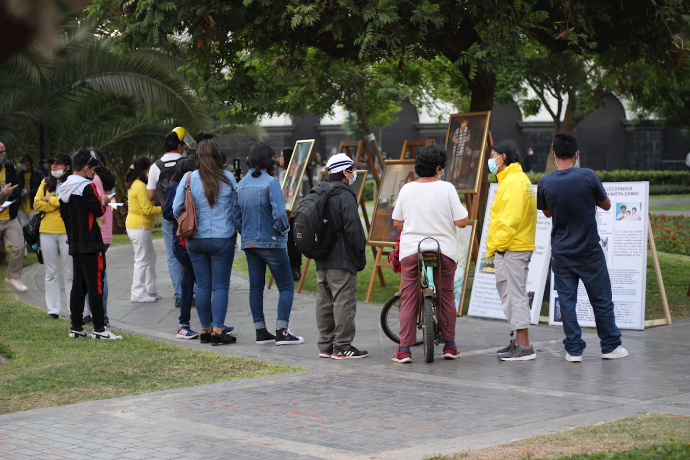 活动中,秘鲁学员通过扩音器向人们介绍什么是法轮功,为什么今天大家要聚在这里:一九九九年四月二十五日,逾万名法轮功学员到北京信访办上访请愿,二个月后,中共动用国家机器对法轮功展开铺天盖地的造谣、污蔑、残酷迫害,迫害至今二十二年,仍在继续。学员呼吁大家一起帮助制止迫害。