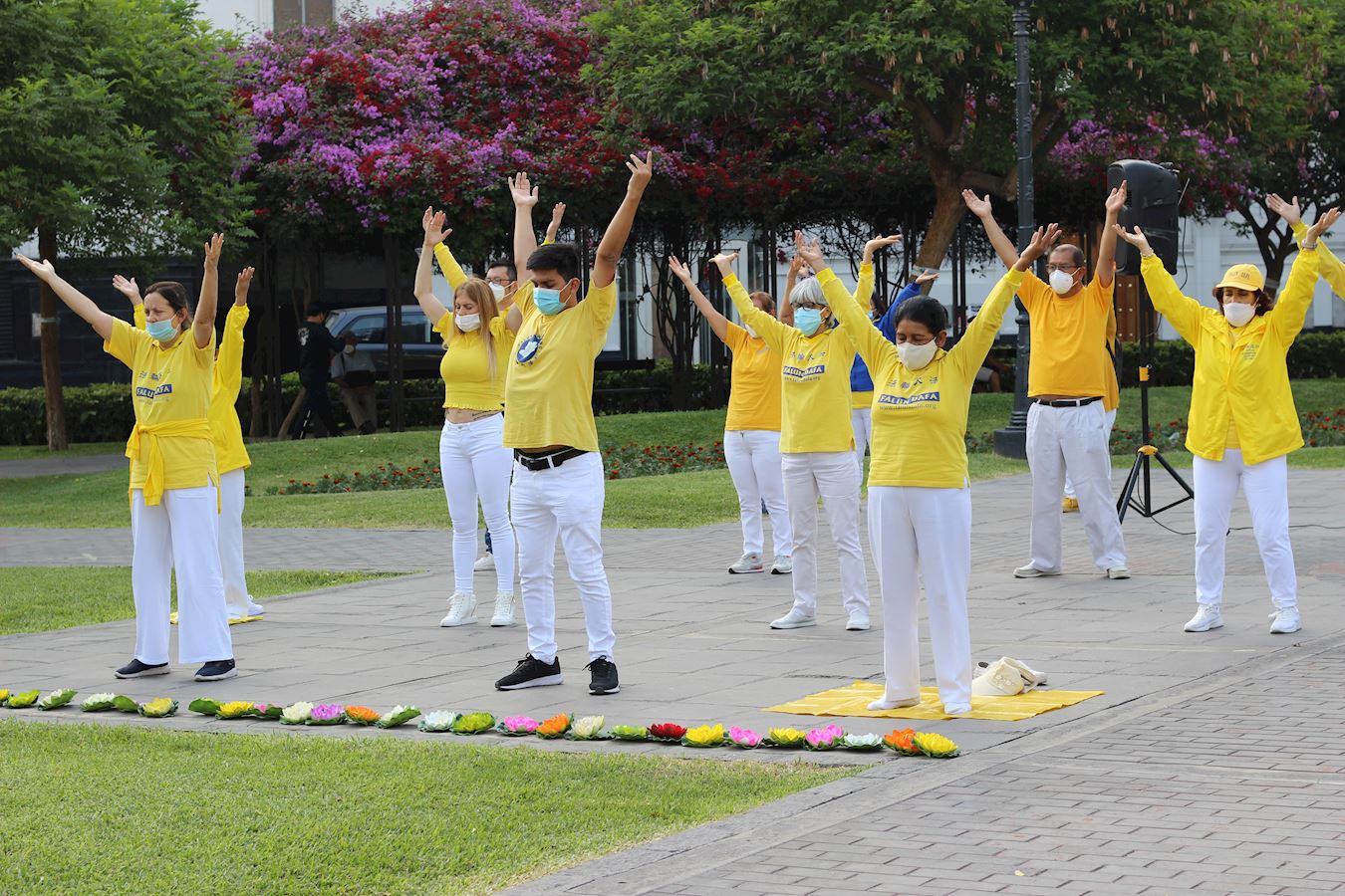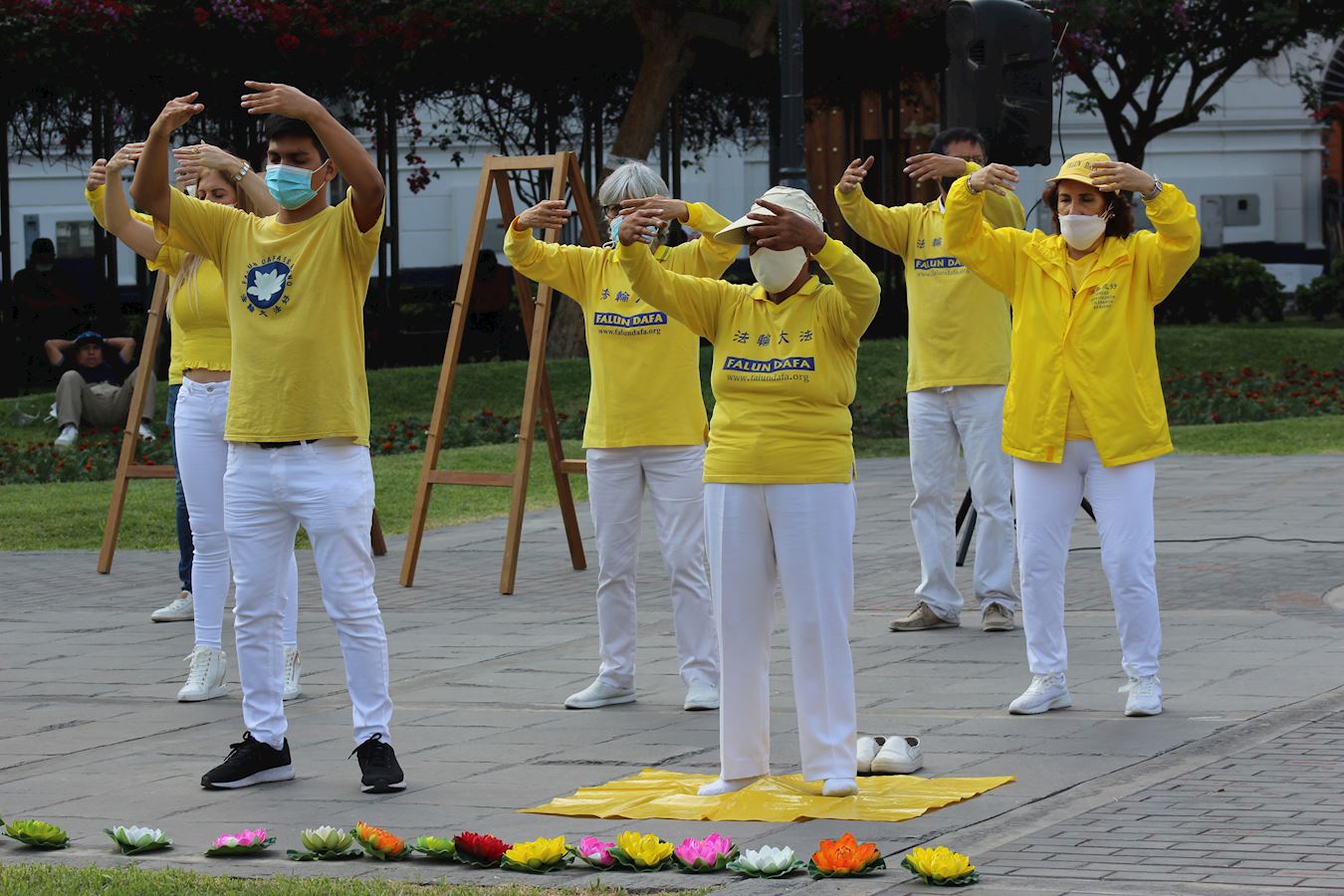 人们看到学员们在伴随着祥和的音乐下,展示舒缓的法轮功功法,纷纷询问在哪里可以学功。学员介绍在传单上有利马和其它城市共十三个炼功点都可以进行免费教功。