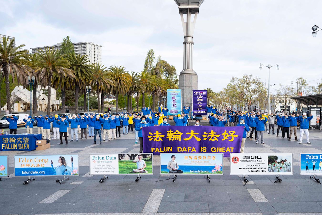 ![]() 图5:旧金山湾区的法轮功学员在渡轮广场,举行集体炼功和集会活动,纪念四·二五和平上访22周年,抗议中共迫害。 |