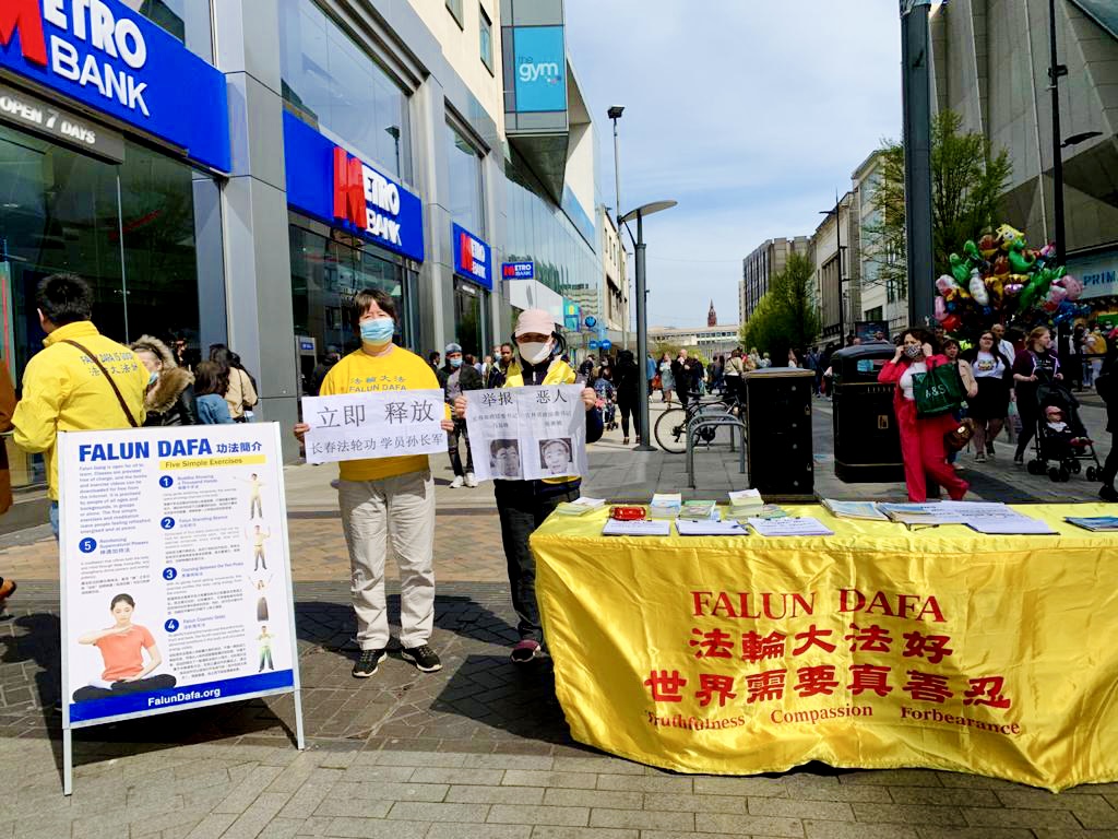 四月二十四日,英国伯明翰(Birmingham)市中心的法轮大法真相展位上,法轮功学员蓝荣与苏珊打出展板:“立即释放长春法轮功学员孙长军”、“举报洗脑班恶人:长春市政法委610办公室书记马延峰、吉林省政法委610办公室书记侯淅敏”。