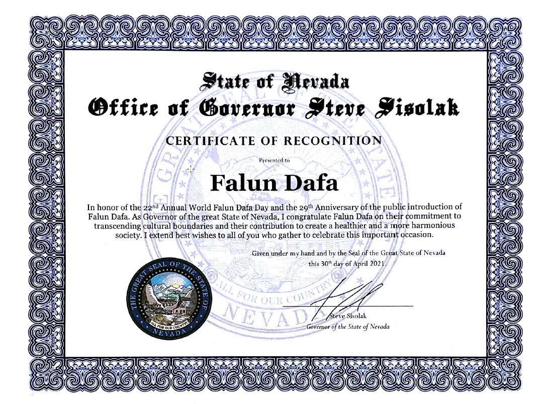 为庆祝第二十二届世界法轮大法日、法轮大法洪弘传世界二十九周年,作为内华达州州长,我祝贺法轮大法致力于超越文化界限,为建立更健康,更融洽的社会做出的贡献。我向所有参加集会庆祝这一重要日子的学员致以良好的祝愿。