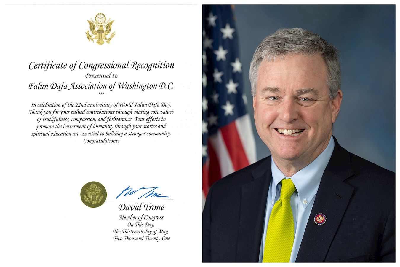 美国马里兰州联邦众议员戴维·特朗(David Trone)为“世界法轮大法日”颁发国会褒奖证书,感谢法轮大法学员弘扬真、善、忍价值理念。