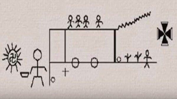 一种简明清楚的解释如下:左边的大人象征伟大的高级生命(Great Spirit),神圣的“卍”代表着来自宇宙的精神力量,象太阳的光芒普照人类。