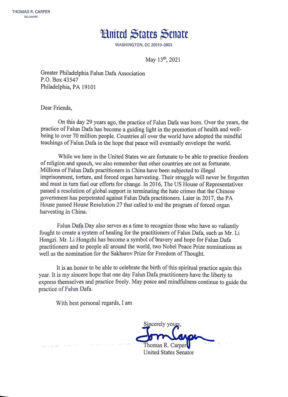 ![]() 图:特拉华州联邦参议员Thomas R. Carper的贺信 |