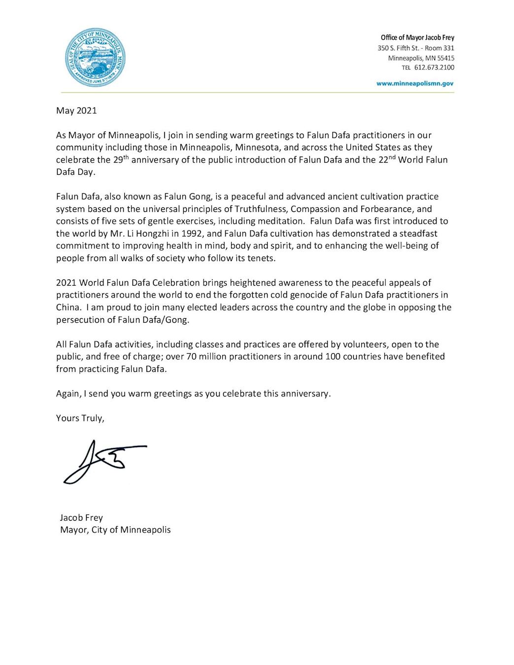 在庆祝法轮大法洪传29周年和第22届世界法轮大法日时,作为明尼阿波利斯市市长,我和大家一起向我们社区的法轮大法修炼者,包括明尼苏达州明尼阿波利斯市和美国各地的法轮大法修炼者,表示热烈问候。