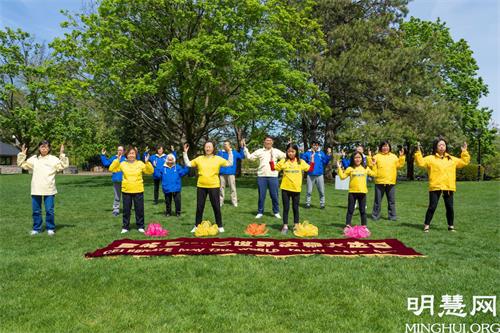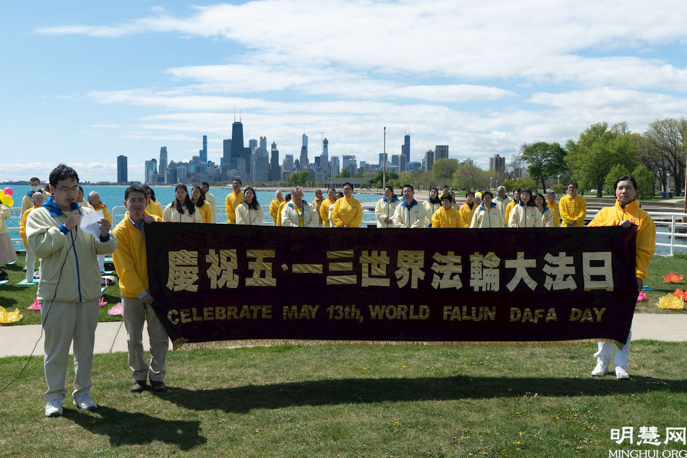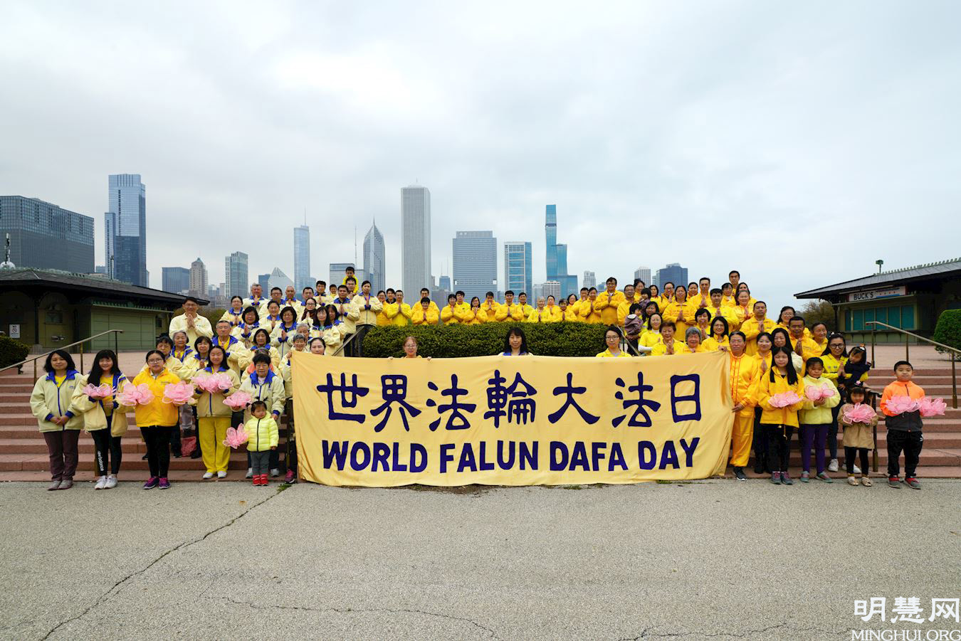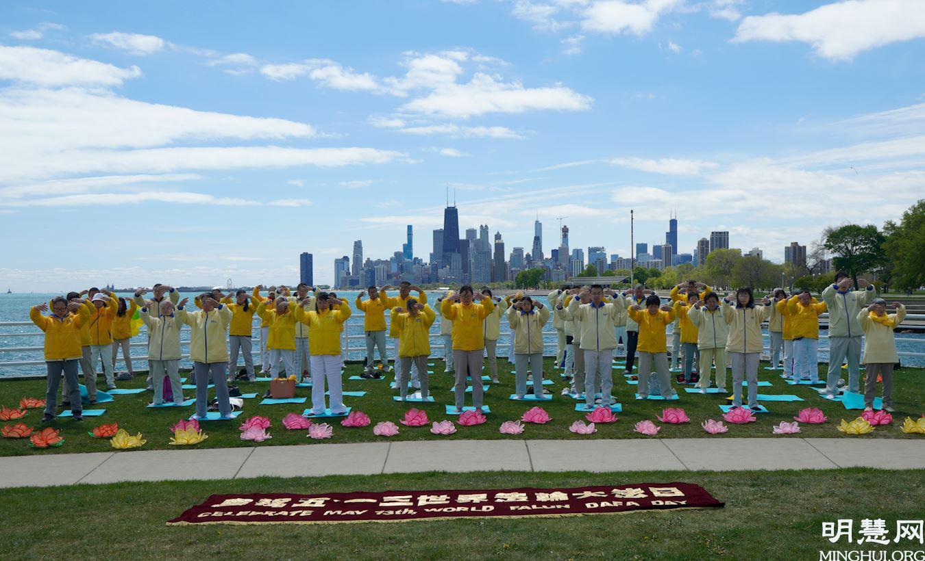 翌日,学员分别在各自炼功点,包括中国城、芝加哥北郊和西郊的炼功点继续庆祝世界法轮大法日。
