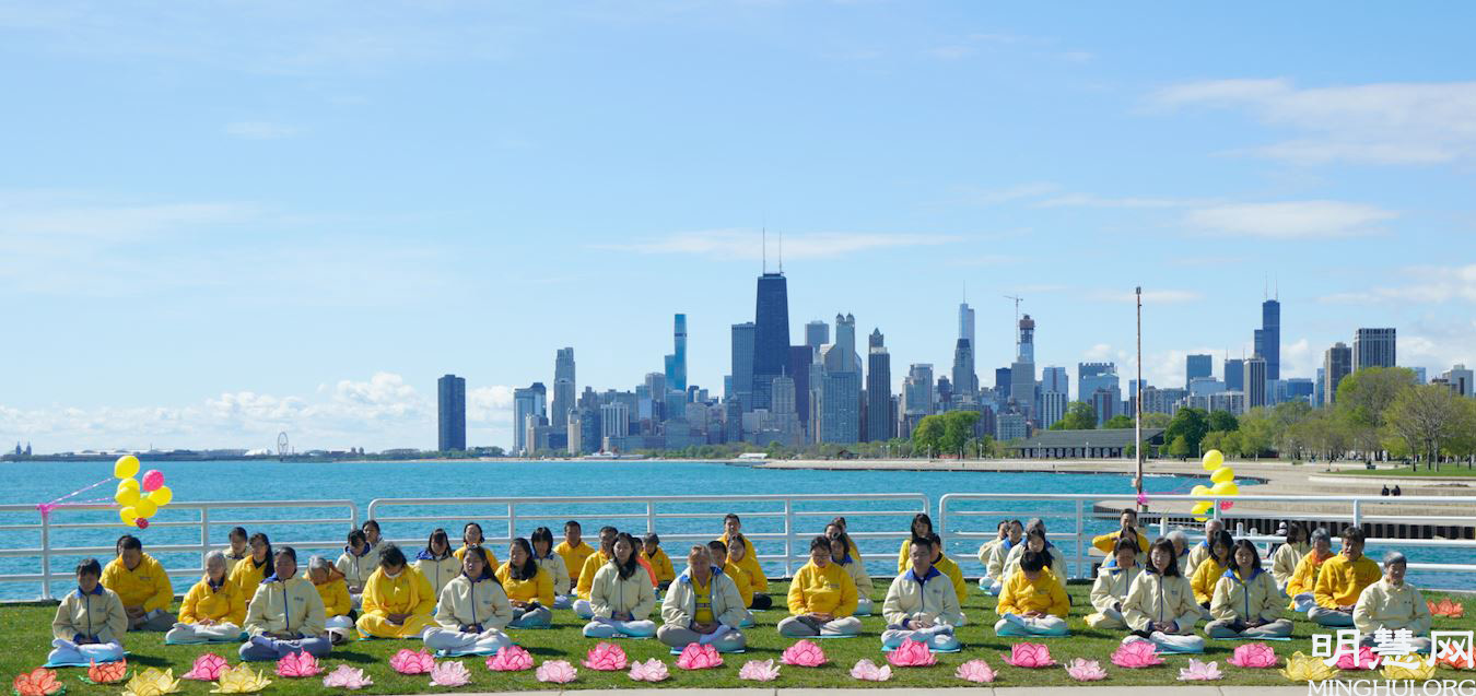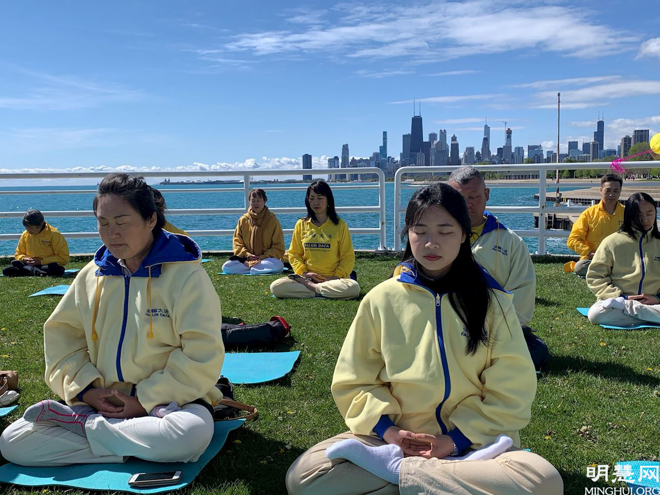 ![]() 图2:5月8日,大芝加哥地区部份法轮功学员在密西根湖畔集体炼功,庆祝“世界法轮大法日”,并恭贺师父华诞。 |