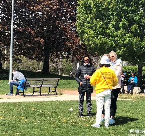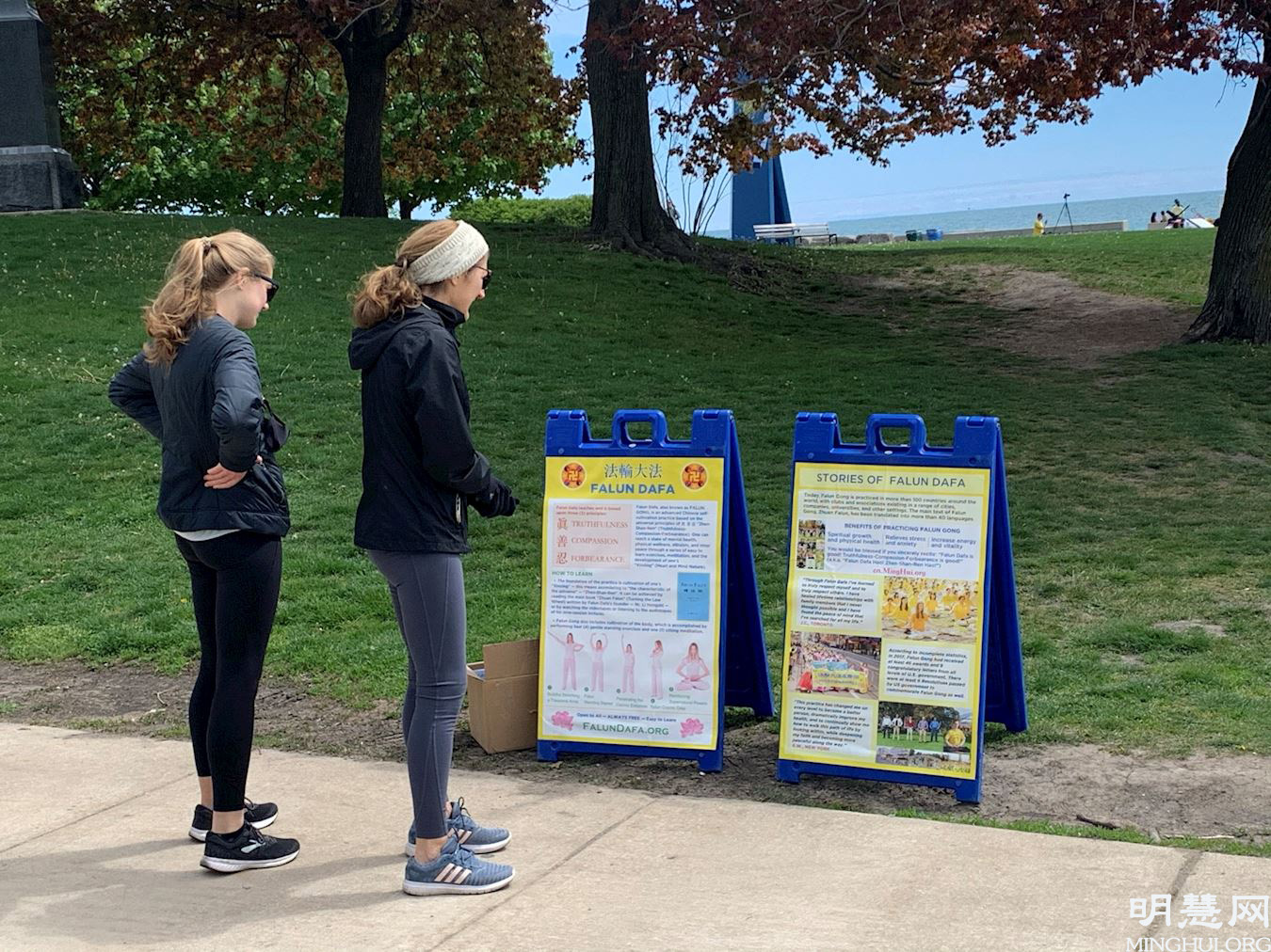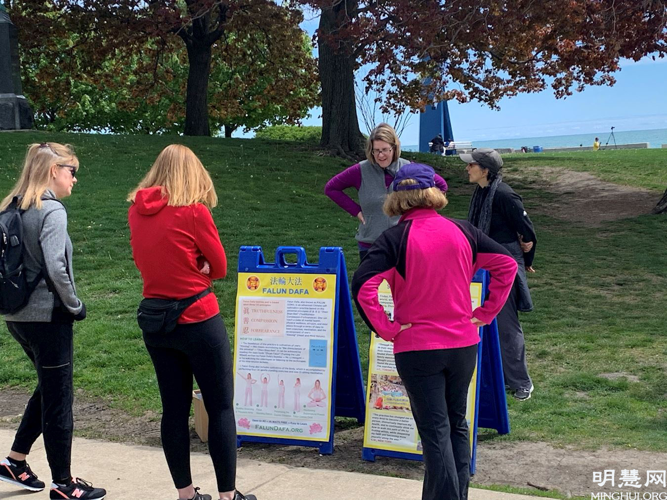 家住附近的德雷尔(Derrell)、卡罗尔(Carol)、和保拉(Paula)远远的看到法轮功学员炼功,主动走过来询问,一位学员给她们看了介绍法轮大法的短片,并讲述了在中国大陆被迫害的真相,她们表示非常高兴终于了解了法轮功真相,表示也要学炼法轮功。