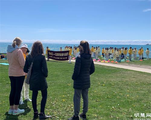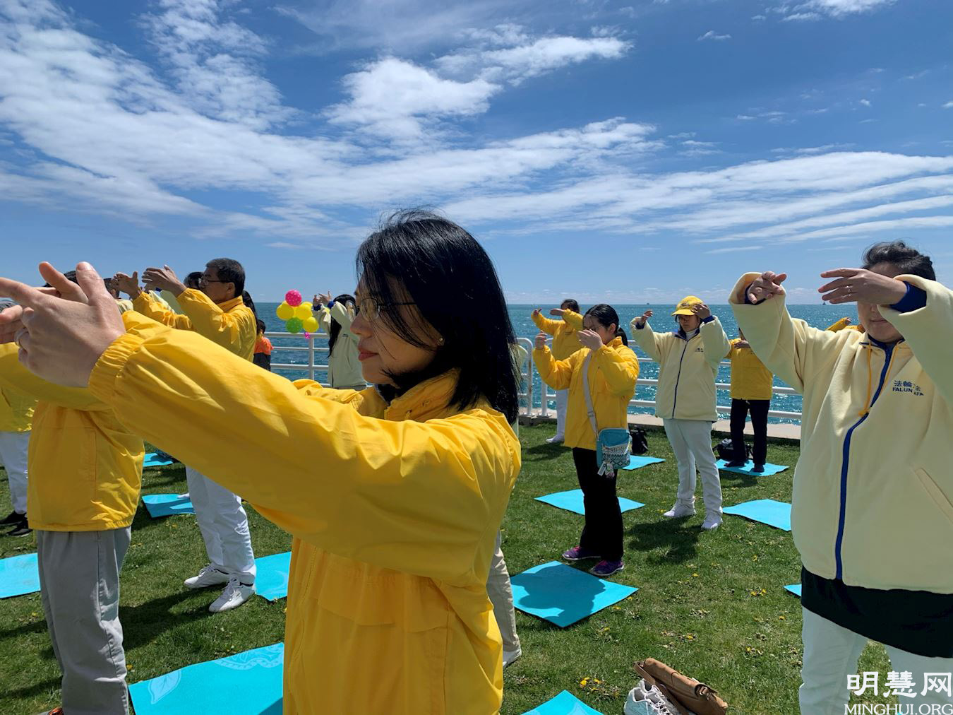 当天的活动以静功开始,碧水蓝天间,学员身着黄色炼功服,前面摆着精心制作的彩莲,在明媚阳光下,分外鲜艳,法轮功学员祥和优美的功法,吸引了很多晨练的人和游客驻足观看,许多人主动了解法轮功,拍照,录像。